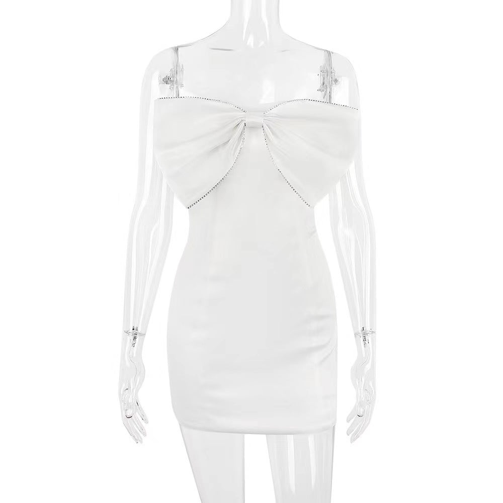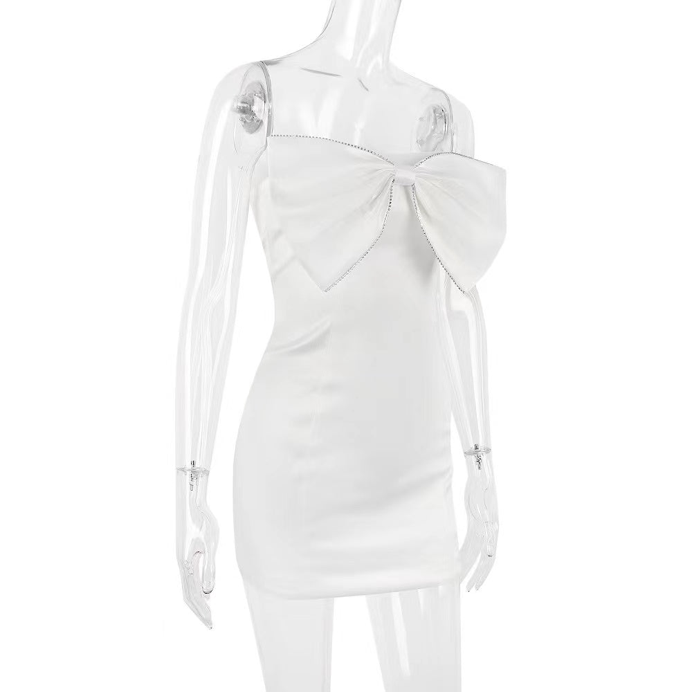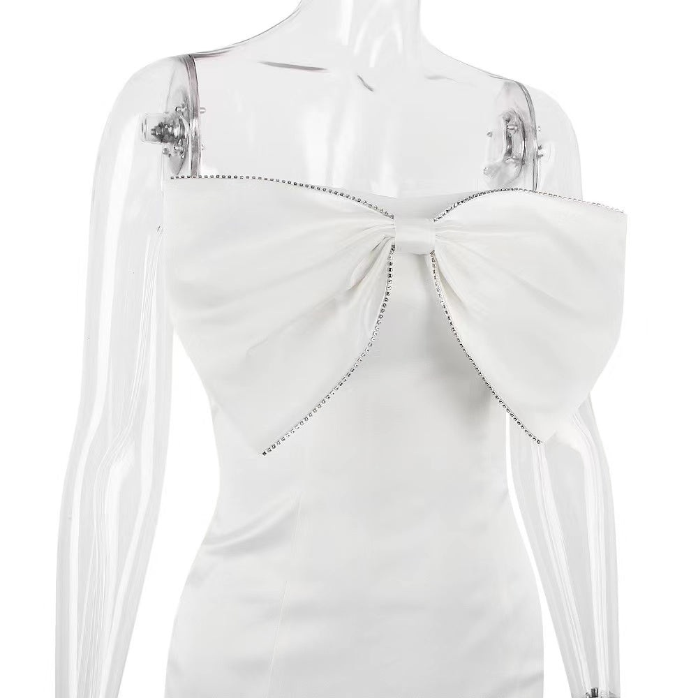 From the luxurious heavyweight duchess satin to the dramatic bow. This mini dress will leave a lasting impression and has party perfect written all over it. The light-catching crystals to the bow glisten beautifully and showcases the structured corseted top.