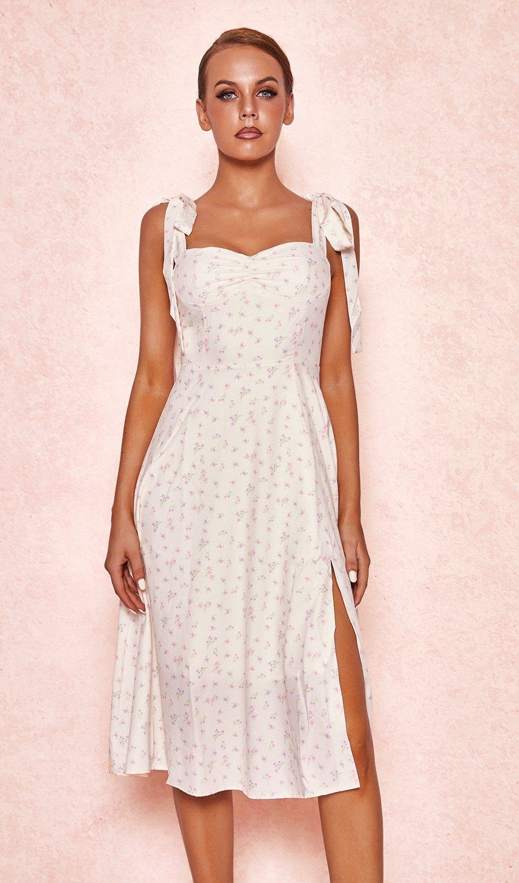Cut from our lightened airy yet substantial crepe fabric. It is just perfect for Summer. It has a corset fit to the bodice and it's boned to the front. back and sides for the ultimate in figure cinching yet it's supremely comfortable. The lightly lined cups are gathered to the centre for a pretty and flattering effect and the shoulder straps tie at the top in a feminine bow. The fabric has a delicate and dainty floral print that's perfect for summer outings. The skirt has special seams that curve over the hips to exaggerate your curves and it's fully lined as you'd expect from us.