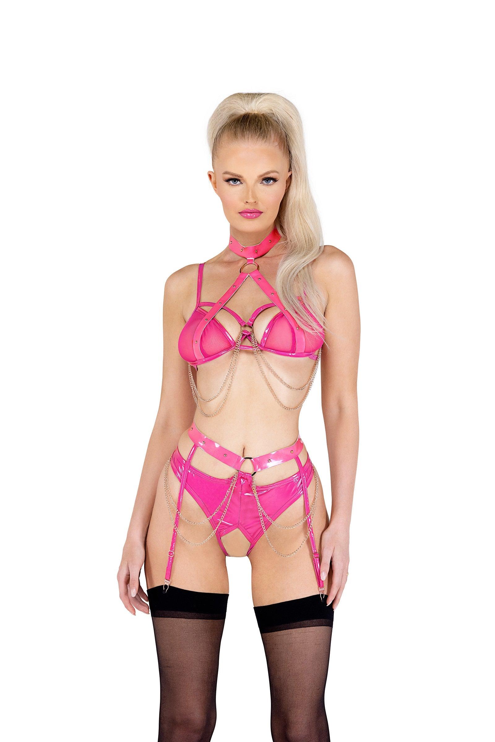 2PC Vinyl and Chain Crotchless Bra Set