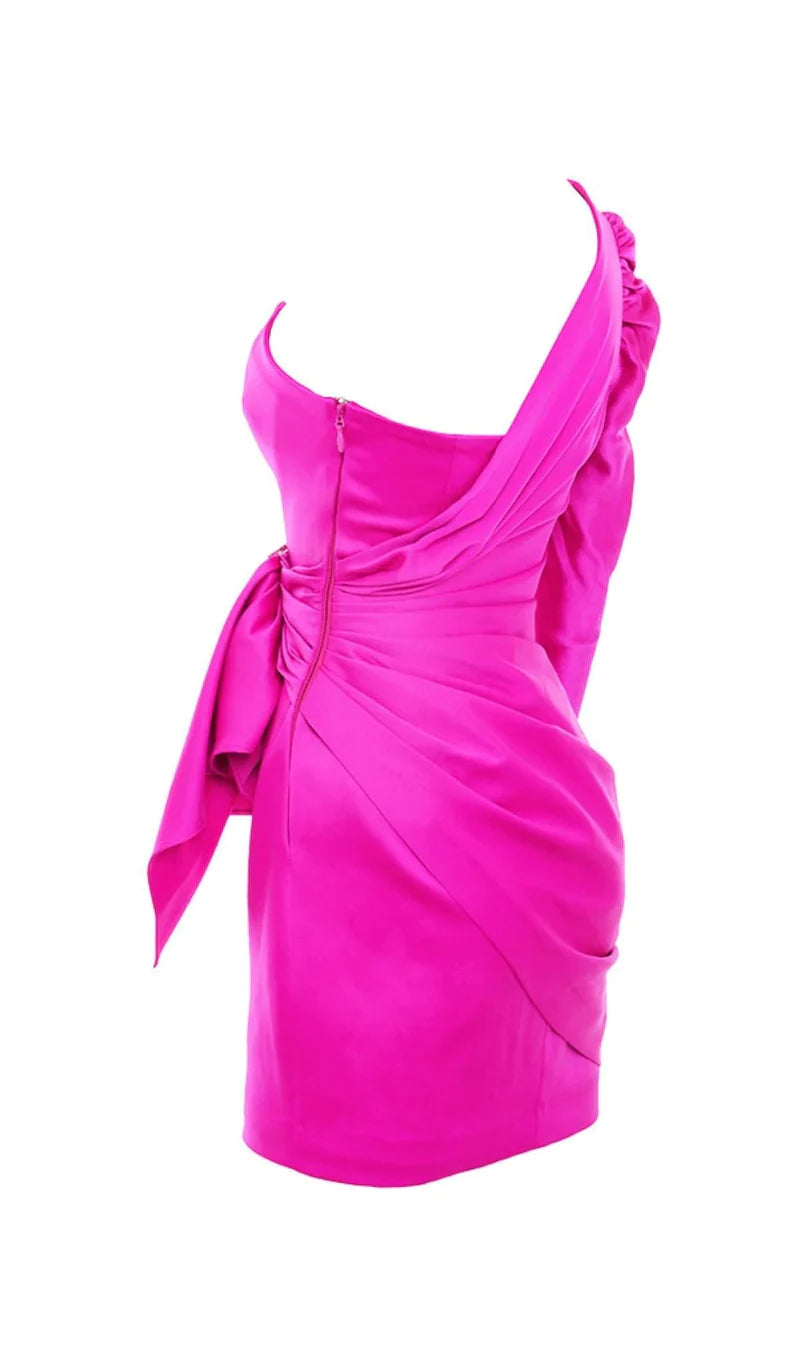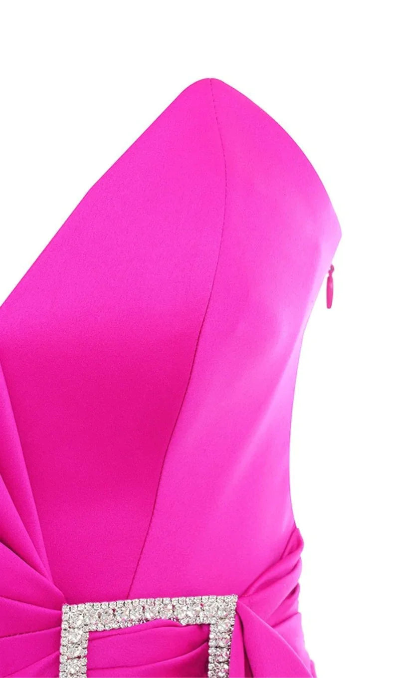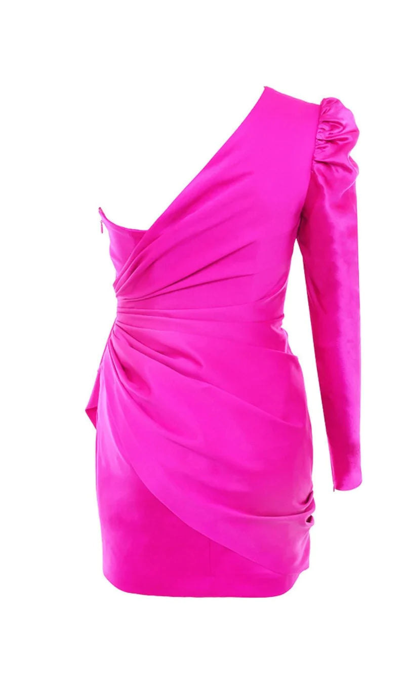 Cut from our very special fluid and lightweight silky satin. Chiara combines asymmetric cuts with supportive corsetry for a fiercely sleek yet feminine vibe. It features a one-shoulder asymmetric cut to the top and the sharp bustline is properly boned inside to the front and sides and has our special side boob boning technique to give incredible support and create cleavage. The non-slip lining to the bust eliminates your slip fears and you can confidently go bra-free in this dress but you can still fit a strapless bra under if you'd prefer. The crystal buckle adds seasonal drama and we love the way the belt snatches the waist to give hourglass proportions. The puff sleeve permanently stays up and in place due to our crinoline seaming and the ultra narrowness of the sleeves is achieved by tiny delicate wrist zips.
