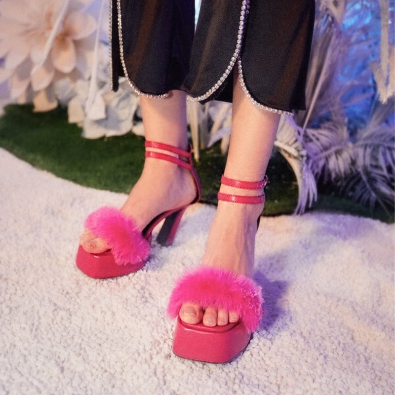 | Name | Pink Furry Platform Sandal Square Toe Ankle Strap Shoes Chunky Heels |