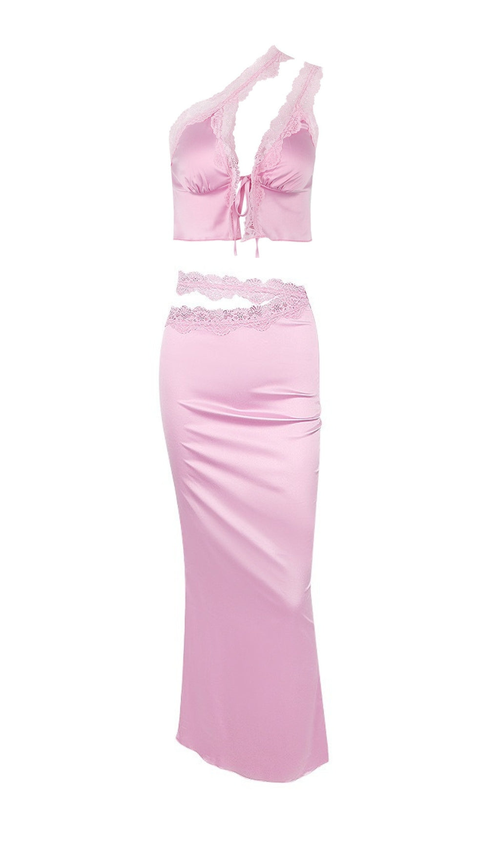 Sleek and ultra chic. PINK LACE TRIM TWO PIECES SUIT is designed to sit on the hips and elegantly skims your curves. falling to a flattering maxi hem. Cut from fluid silk georgette in delicate pink.this two pieces suitfeatures cutouts and delicate lace detailing. Ultra feminine. we love this paired with the matching heels for a romantic date night. It is fully lined for a smooth finish and has a zip to the left side for easy on.