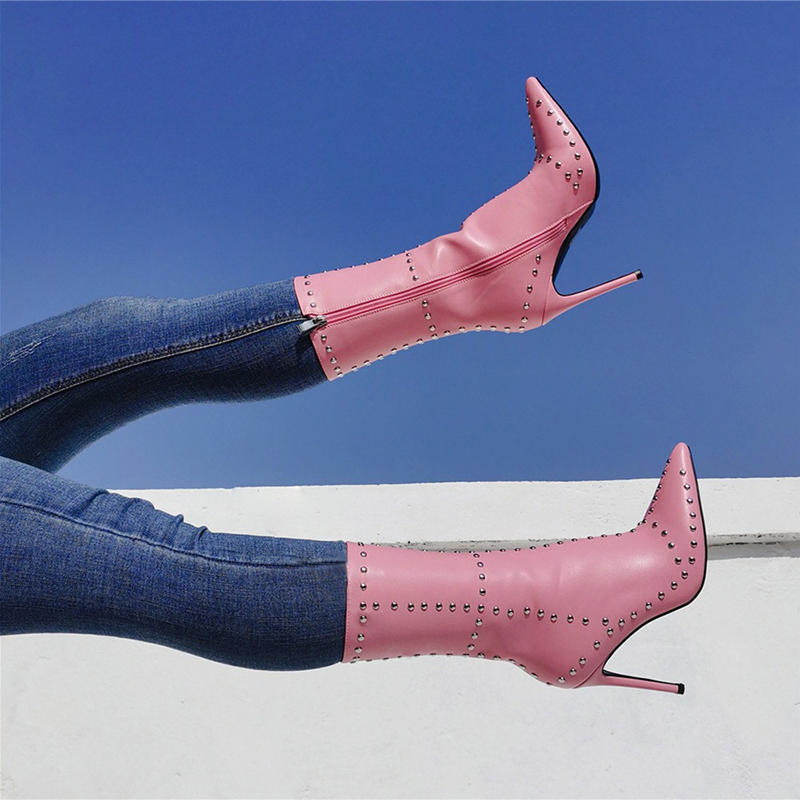 | Name | Pink Mid Calf Zipper Boots Vintage Pointed Stiletto Heels Studs Boots |