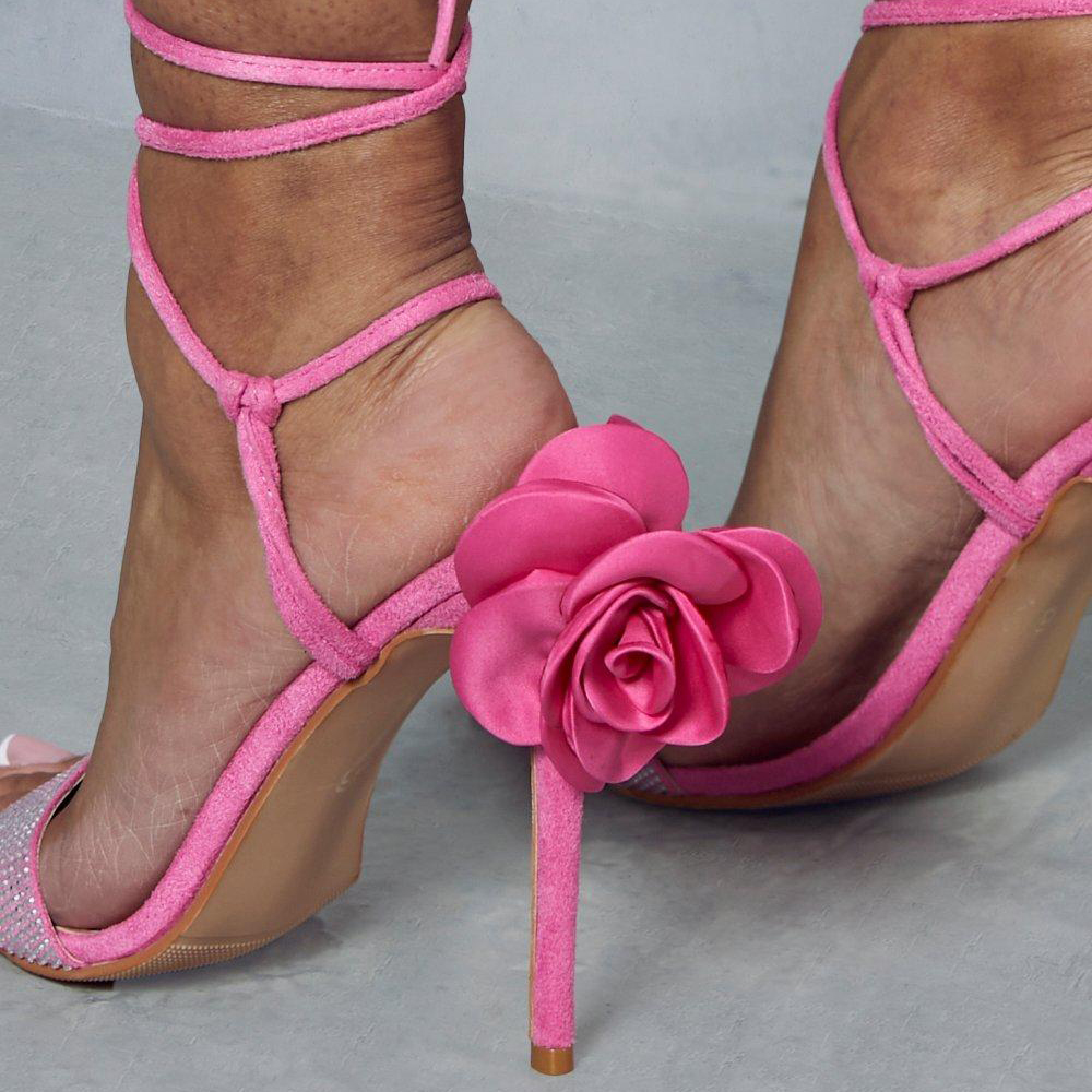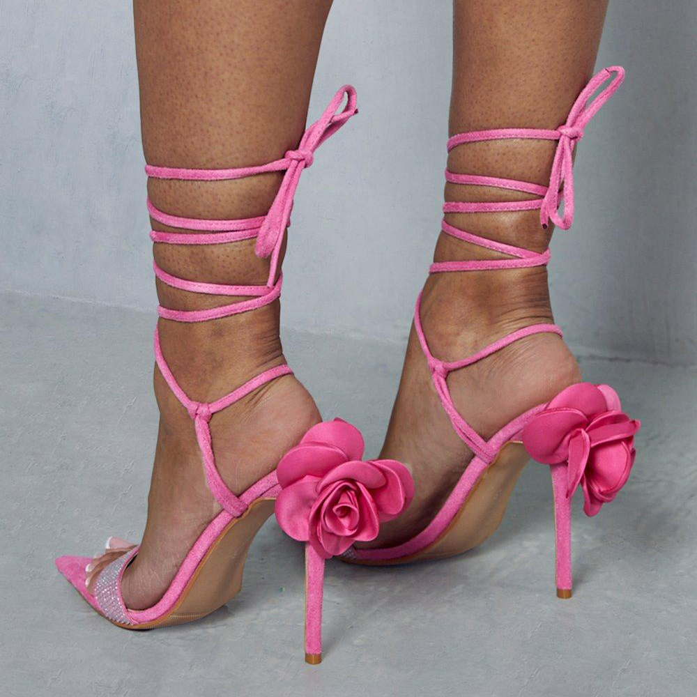| Name | Pink Satin Opened Pointed Toe Rhinestone Band Rose Lace Up Sandals With Stiletto Heels |