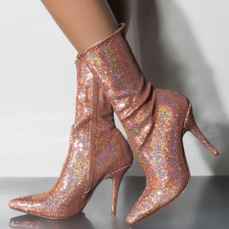 | Name | Pointed Stiletto Heel Women's Sparkling Zipper Shoes Mid Calf Boots |
