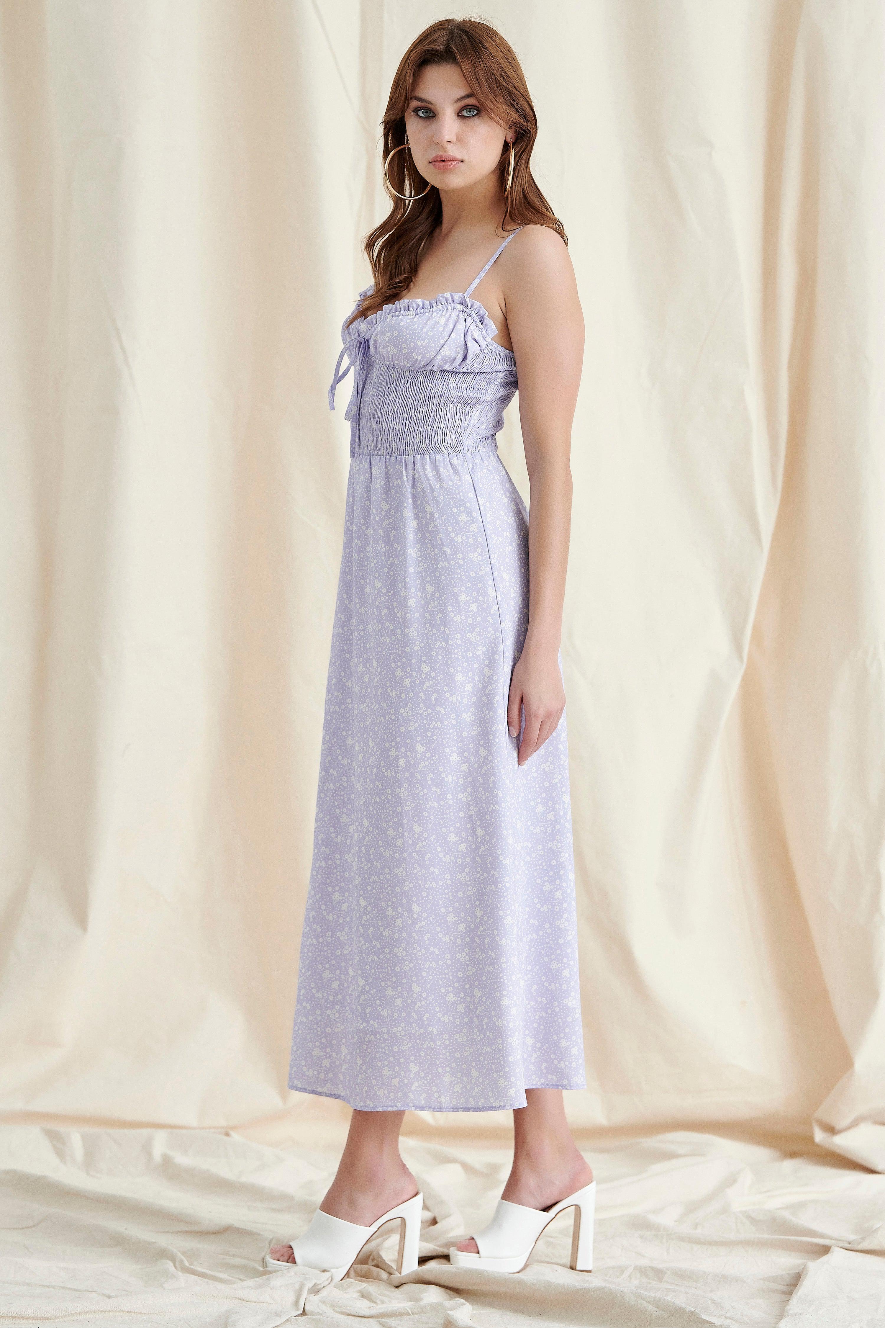 This is patterned with romantic blooms that gives it such a sweet. feminine feel. Made from a lightweight crepe with an elegant sweetheart neckline and pretty gathered bust that fastens with a drawstring tie. The bodice is shirred to add to the delicate detailing and the skirt is cut to a loose silhouette that falls to an ankle grazing hem.