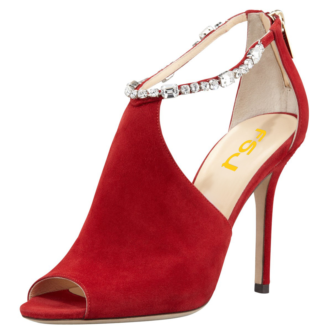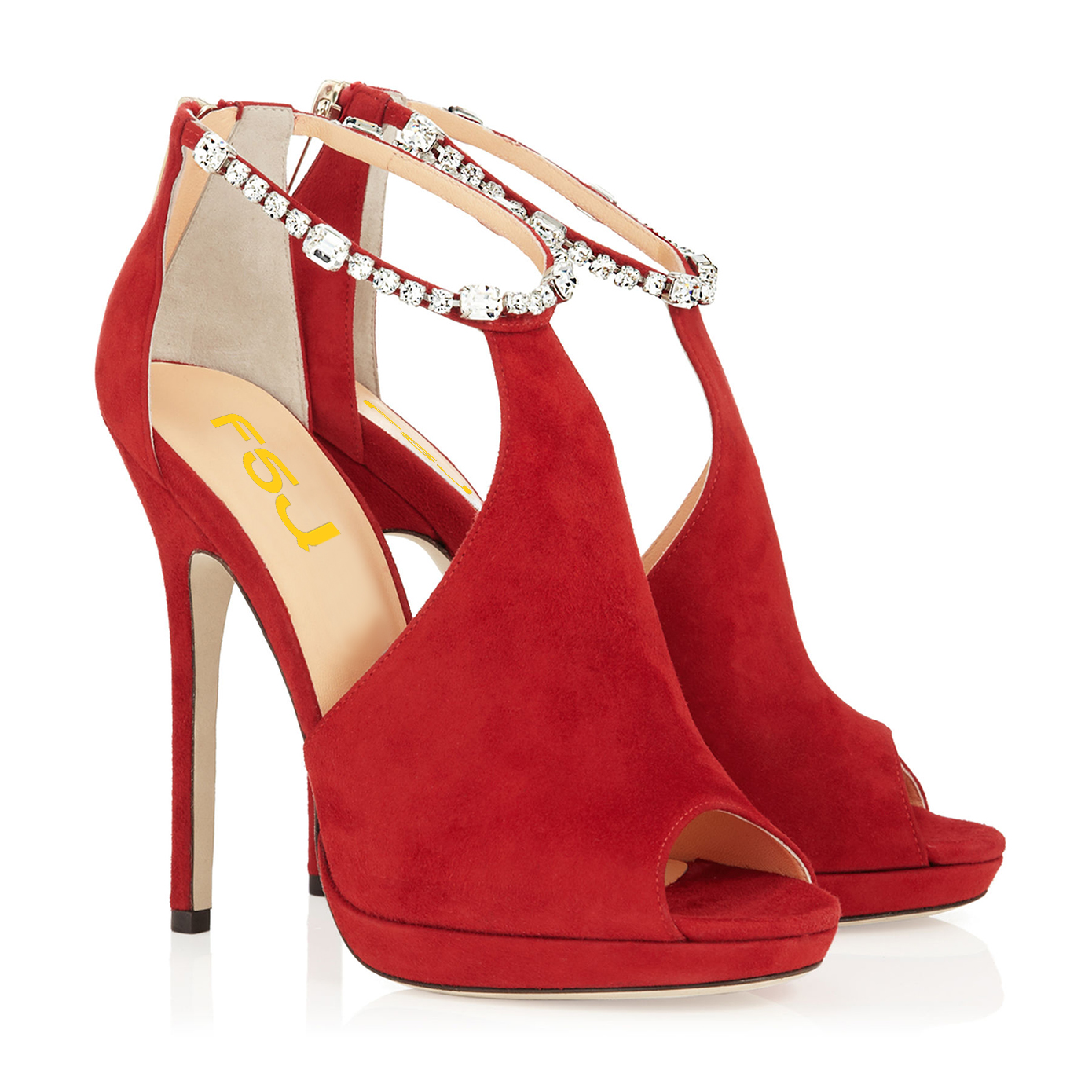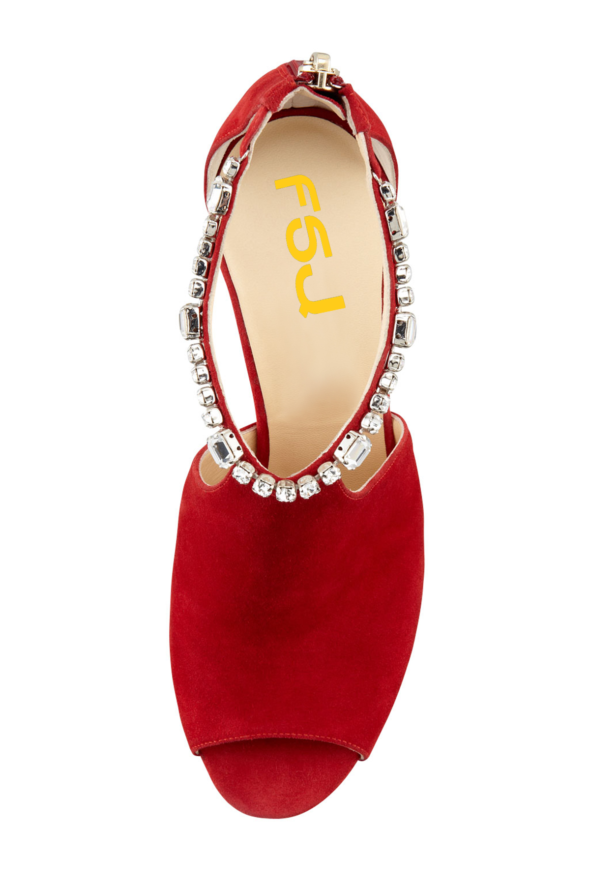 | Name | Red Peep Toe Heels Rhinestone Ankle Strap Vegan Suede Platform Sandals |