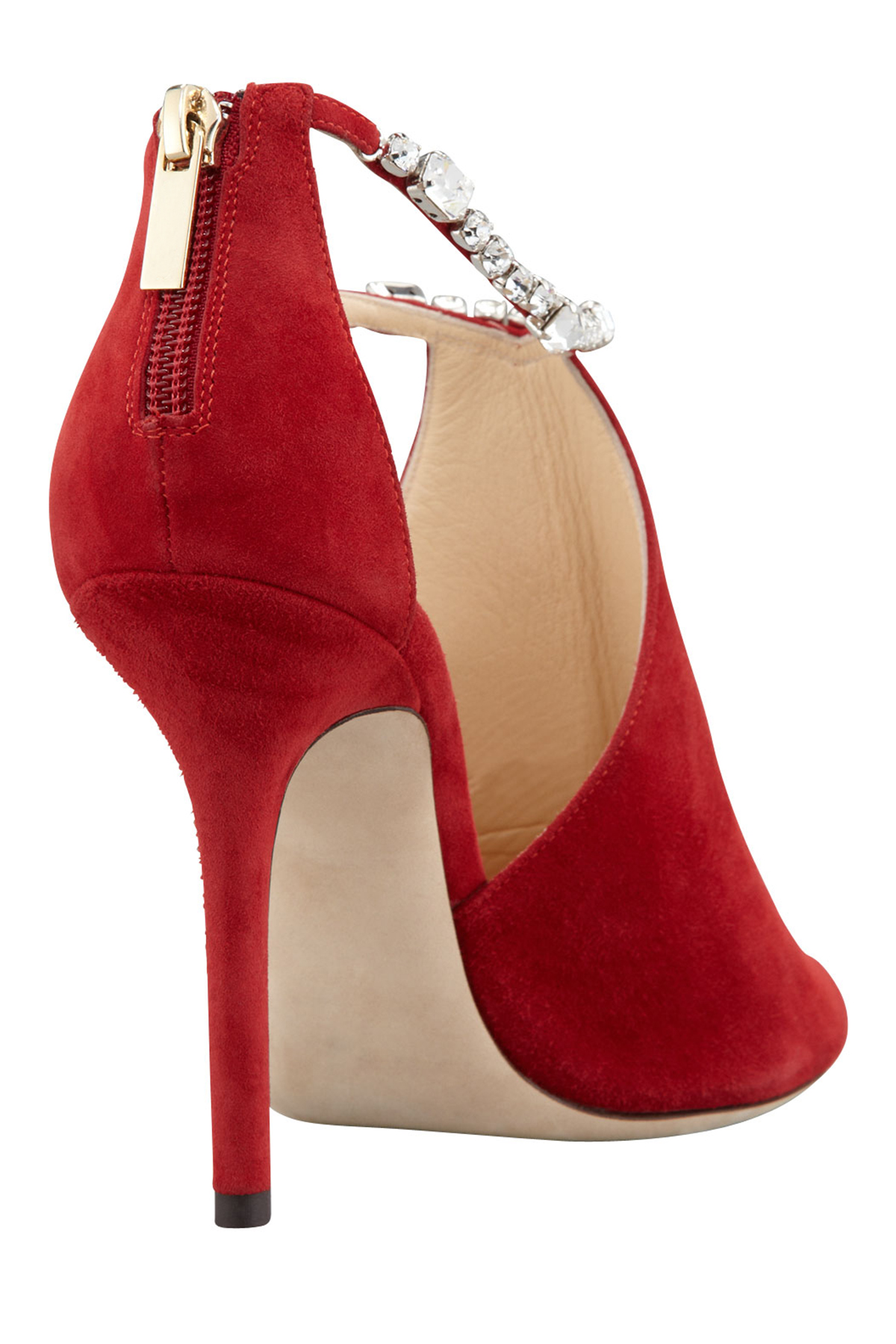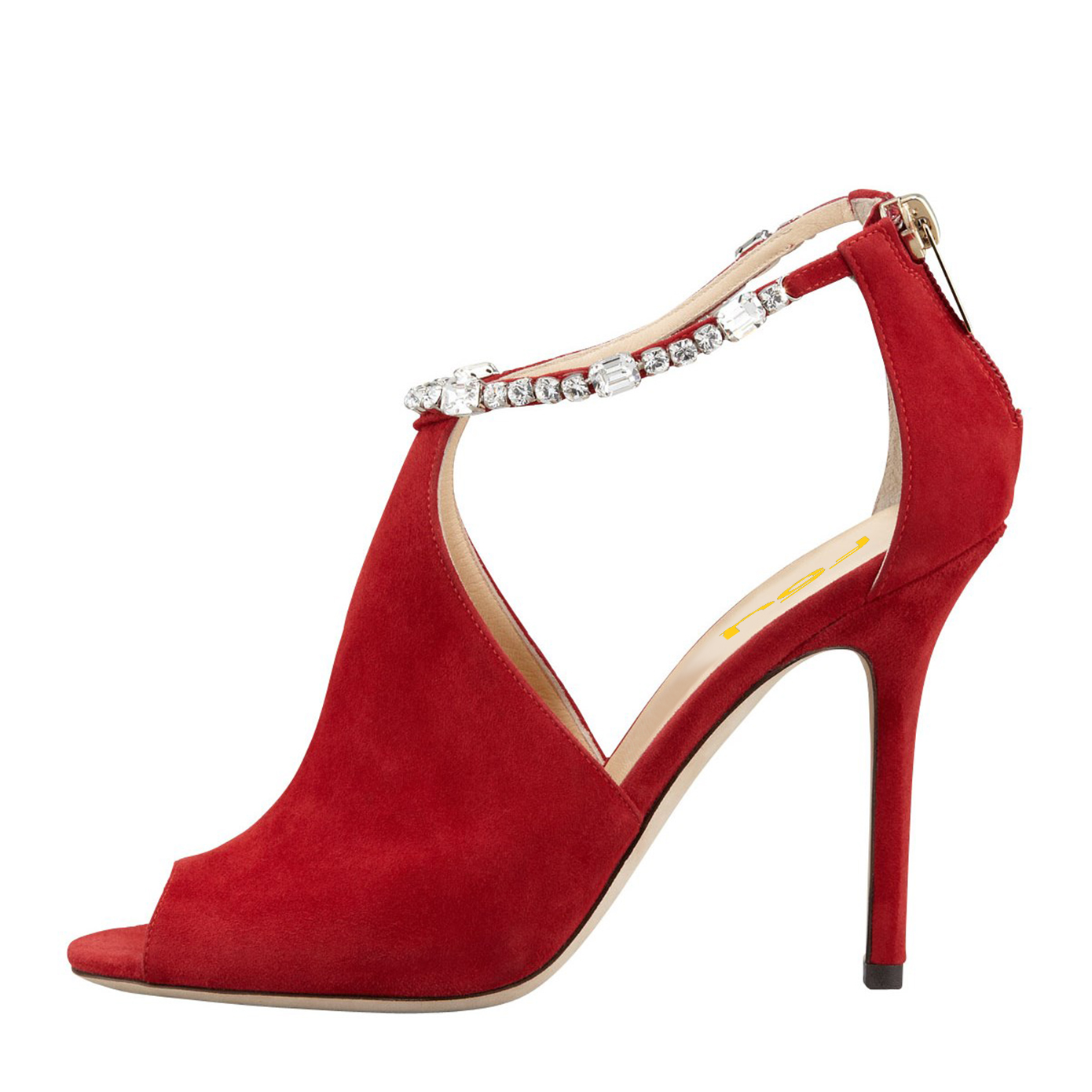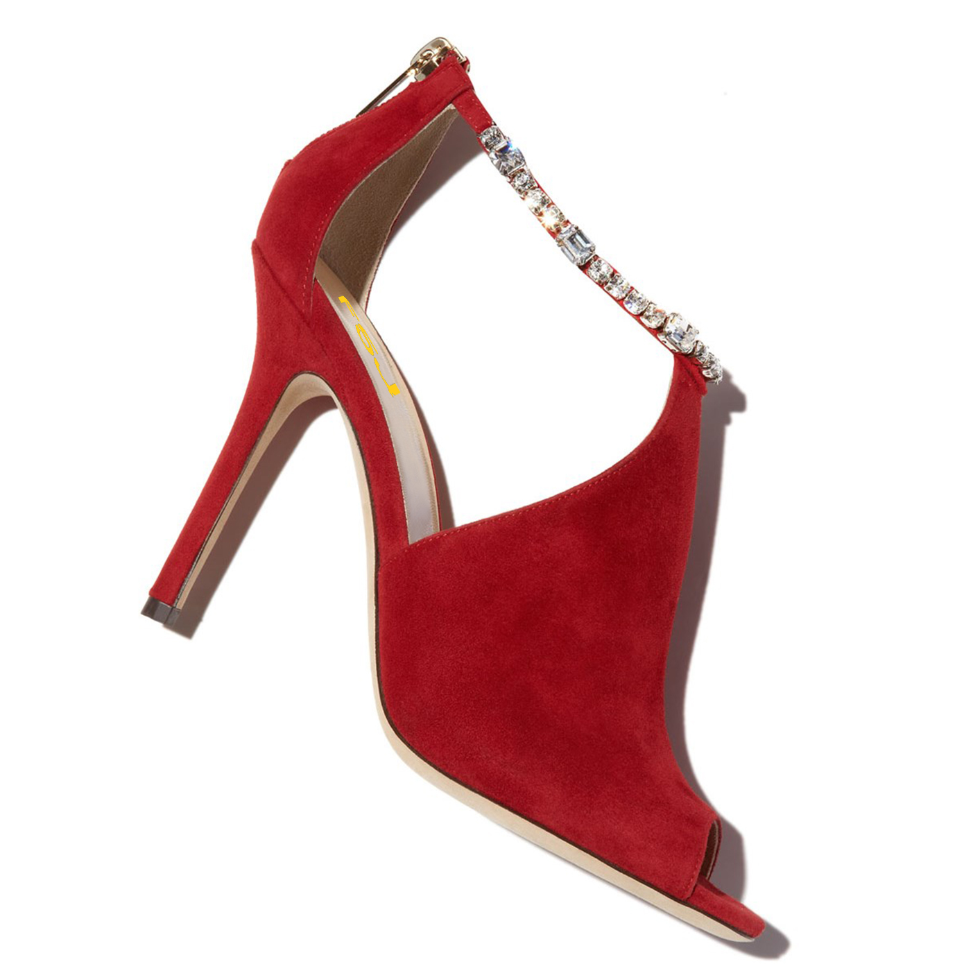 | Name | Red Peep Toe Heels Rhinestone Ankle Strap Vegan Suede Platform Sandals |