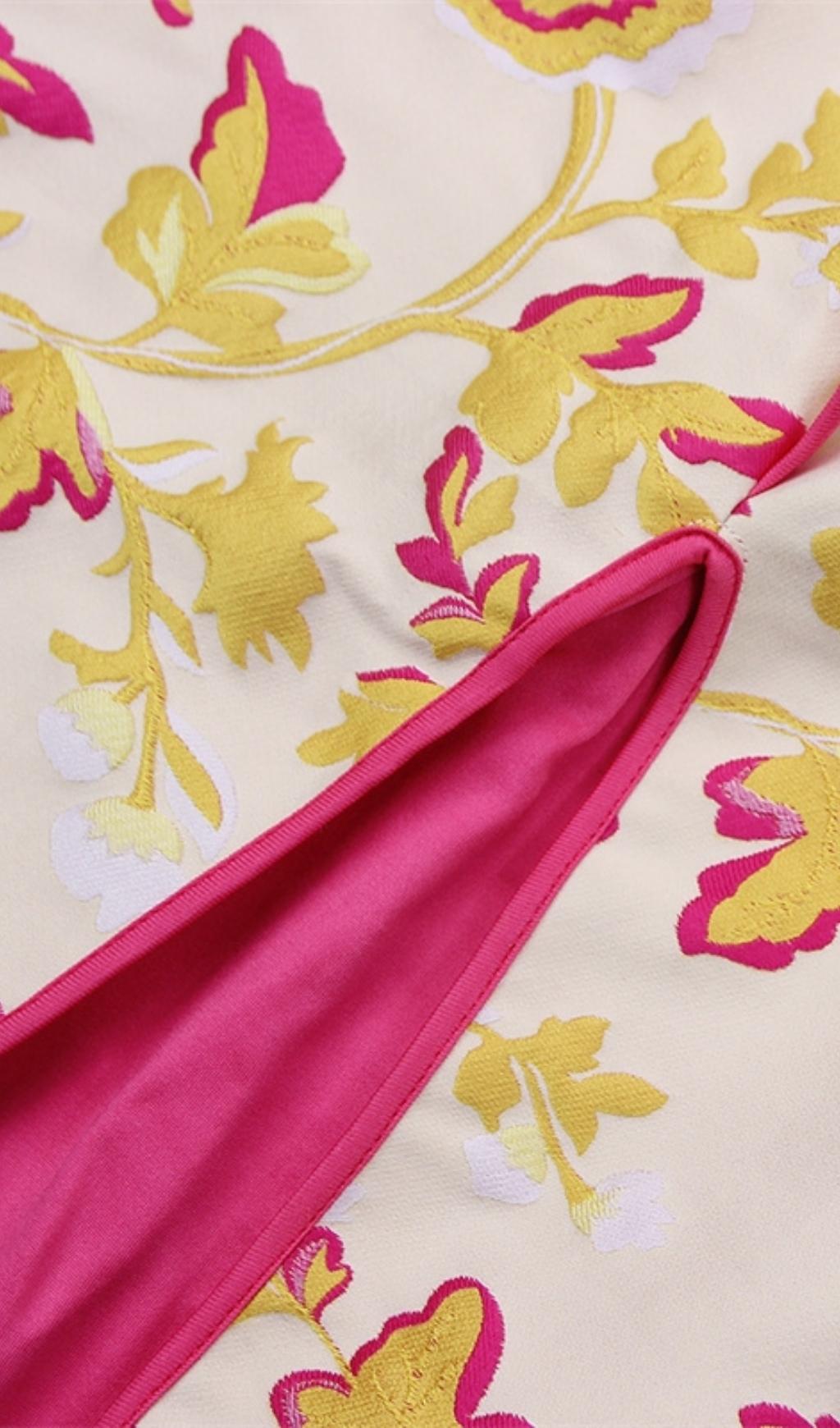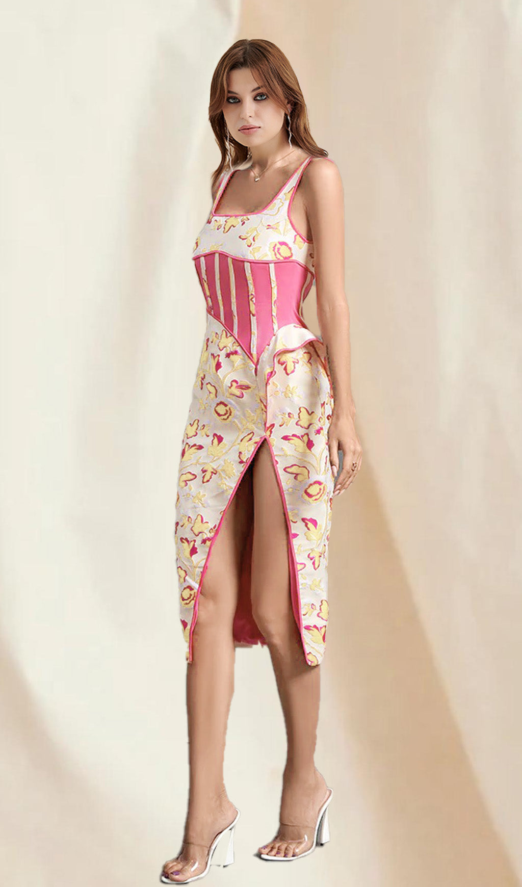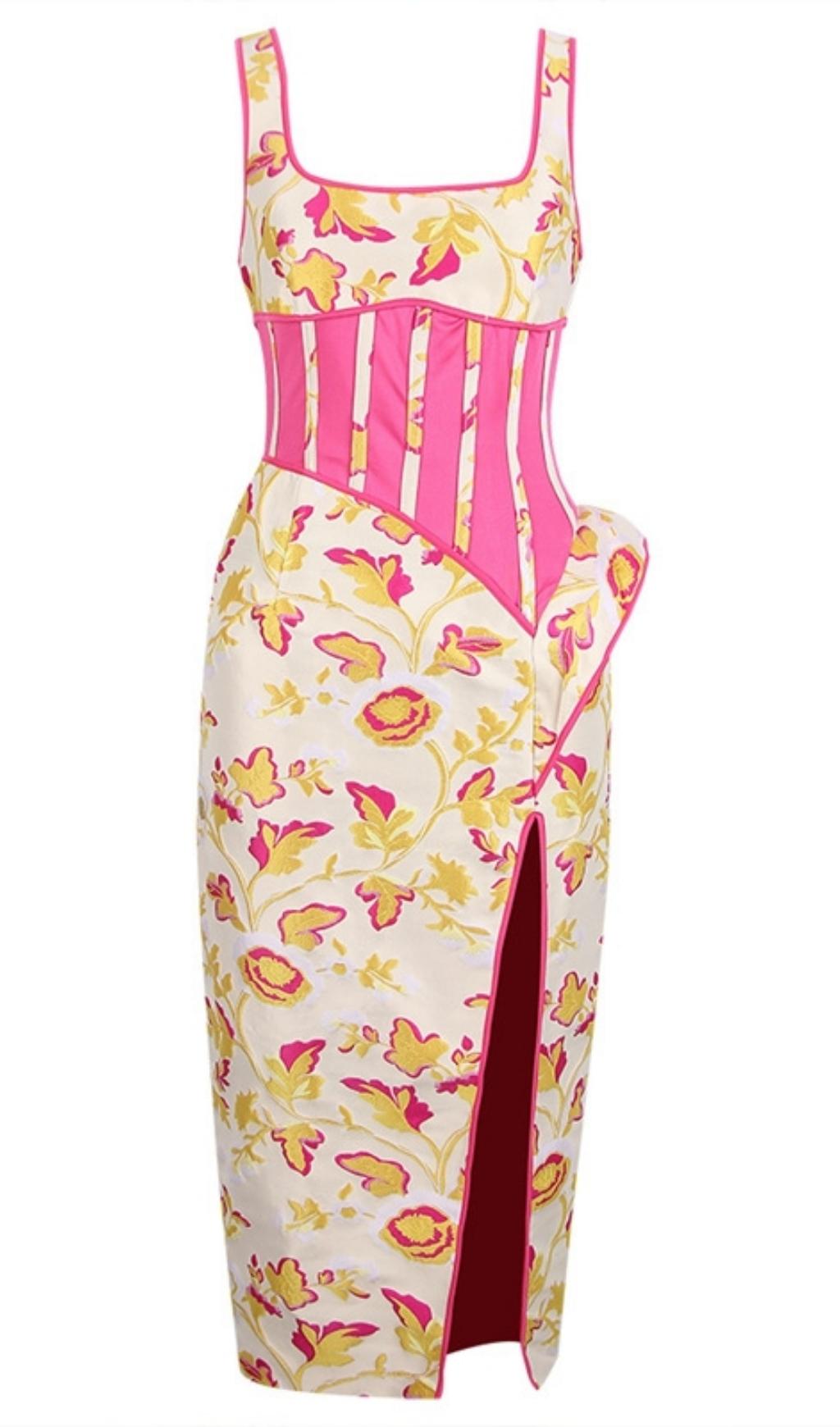 Fall for our Rose Floral Jacquard Midi Dress. The Dress designed in a floraljacquardwith a ruffle detail.The side split reveals a flash of leg and it has a zip to the back for easy on.Pair with your favorite heels and you'll be ready for date night.