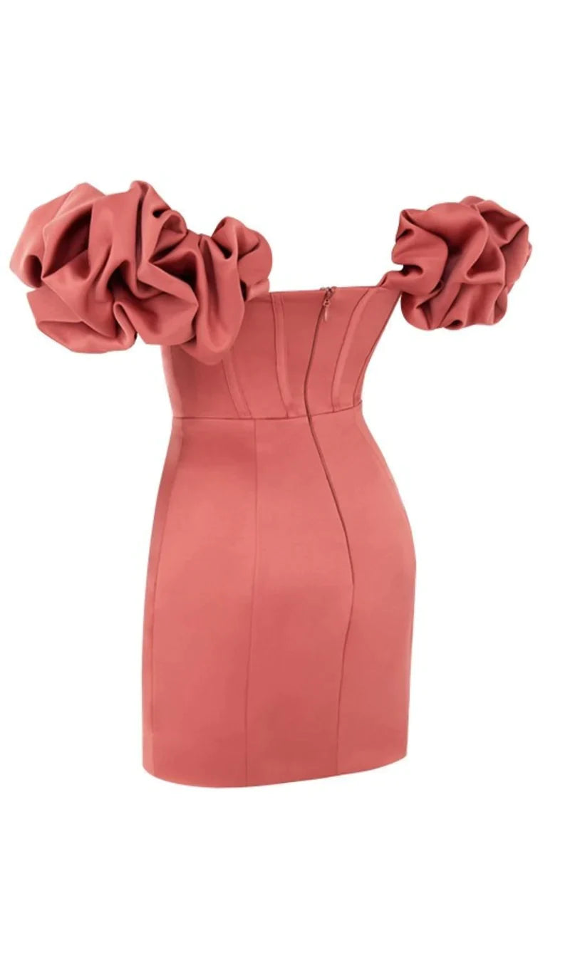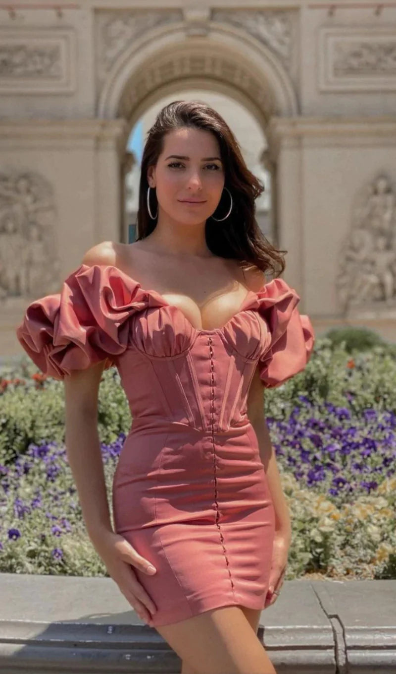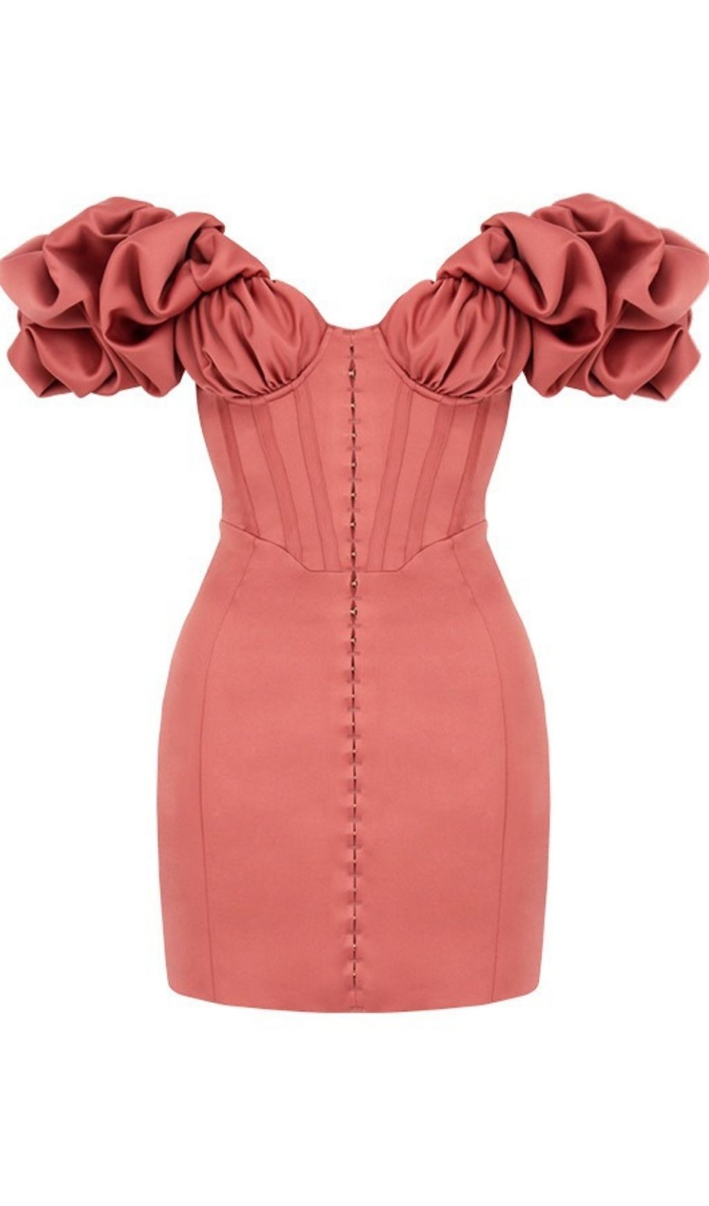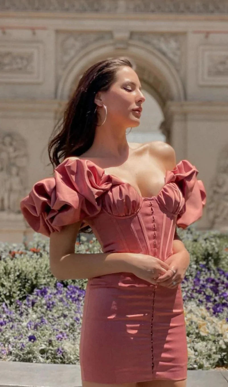Pretty in pink. this dress is filled with romance and ruffles and is simply incredible. Made from our lustrous duchess satin with pretty. feminine detailing. The bodice has our amazing corsetry boning to really snatch the waist and create the perfect hourglass silhouette. hugging your curves to accentuate the hips and highlight your peach.
