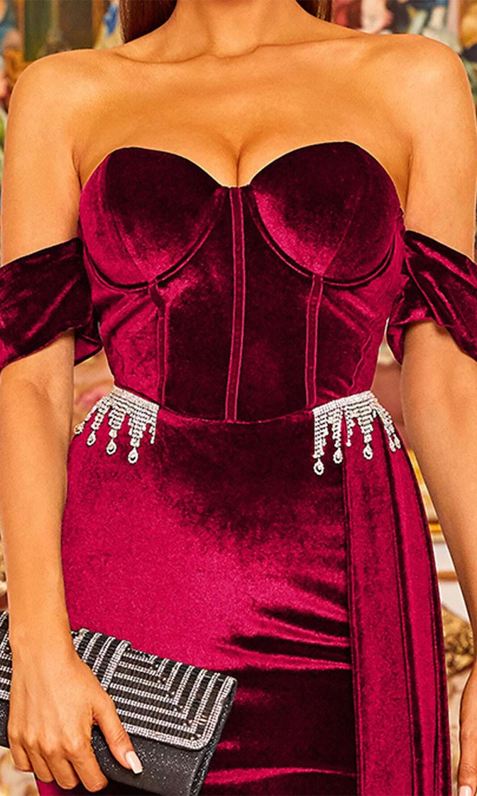 Rhinestone accents at the hips add sparkle and shine to this elegant velvet maxi dress. The Royal Romance maxi dress features draped off the shoulder short sleeves. a bustier bodice with a sweetheart neckline. and a draped sash that hangs from the waist to the hem. It's detailed with a high side slit to show lots of leg.