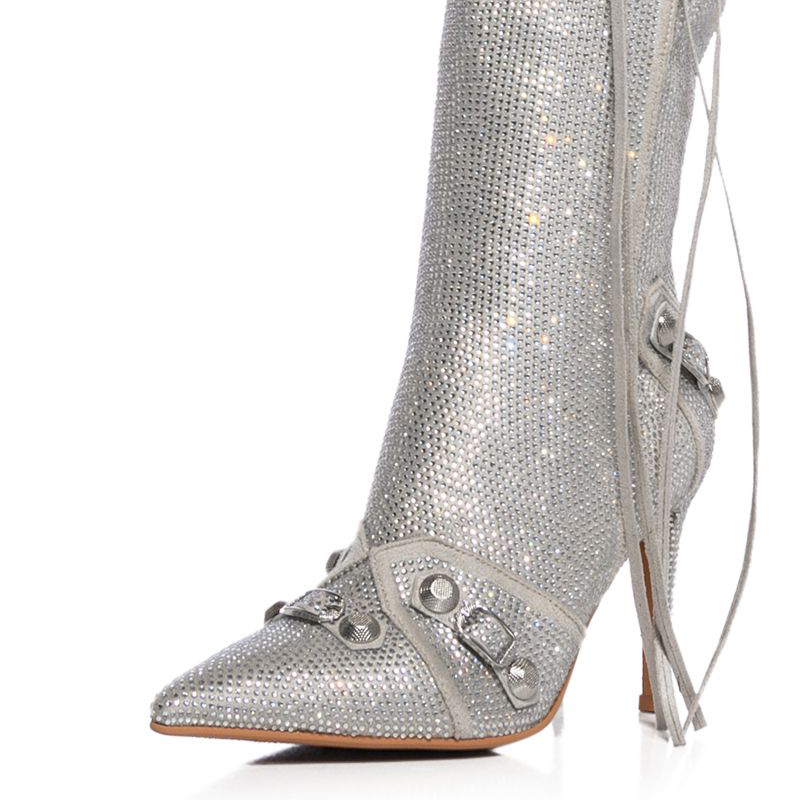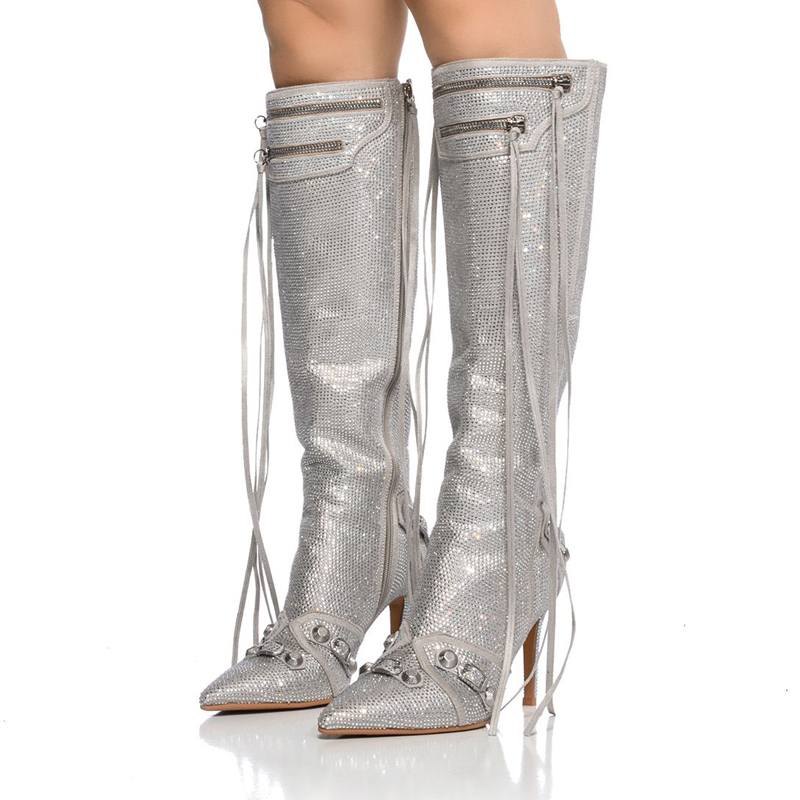 - The pointed toe silhouette adds a touch of sophistication. while the shimmering rhinestone embellishments make a statement with every step. Crafted with meticulous attention to detail. these boots feature a convenient zipper closure for easy wear. The silver color complements any outfit. making them versatile for both formal occasions and nights out. Step out in confidence and showcase your impeccable taste with these eye-catching stiletto boots. Make a lasting impression and embrace your inner fashionista with this exquisite footwear.
