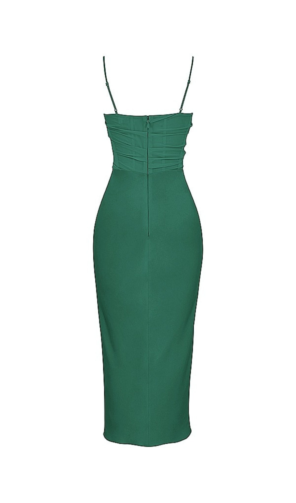 Our midi dress has an elegant and glamorous feel in a fresh forest hue. The bodice is cut from a semi-sheer georgette and fitted with our incredible corsetry boning to cinch the waist. It has a zip to the back for easy on and is fully lined for a smooth and comfortable finish.