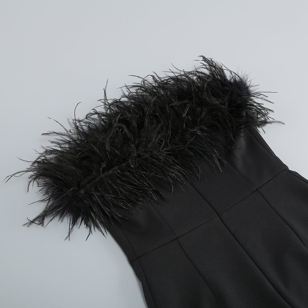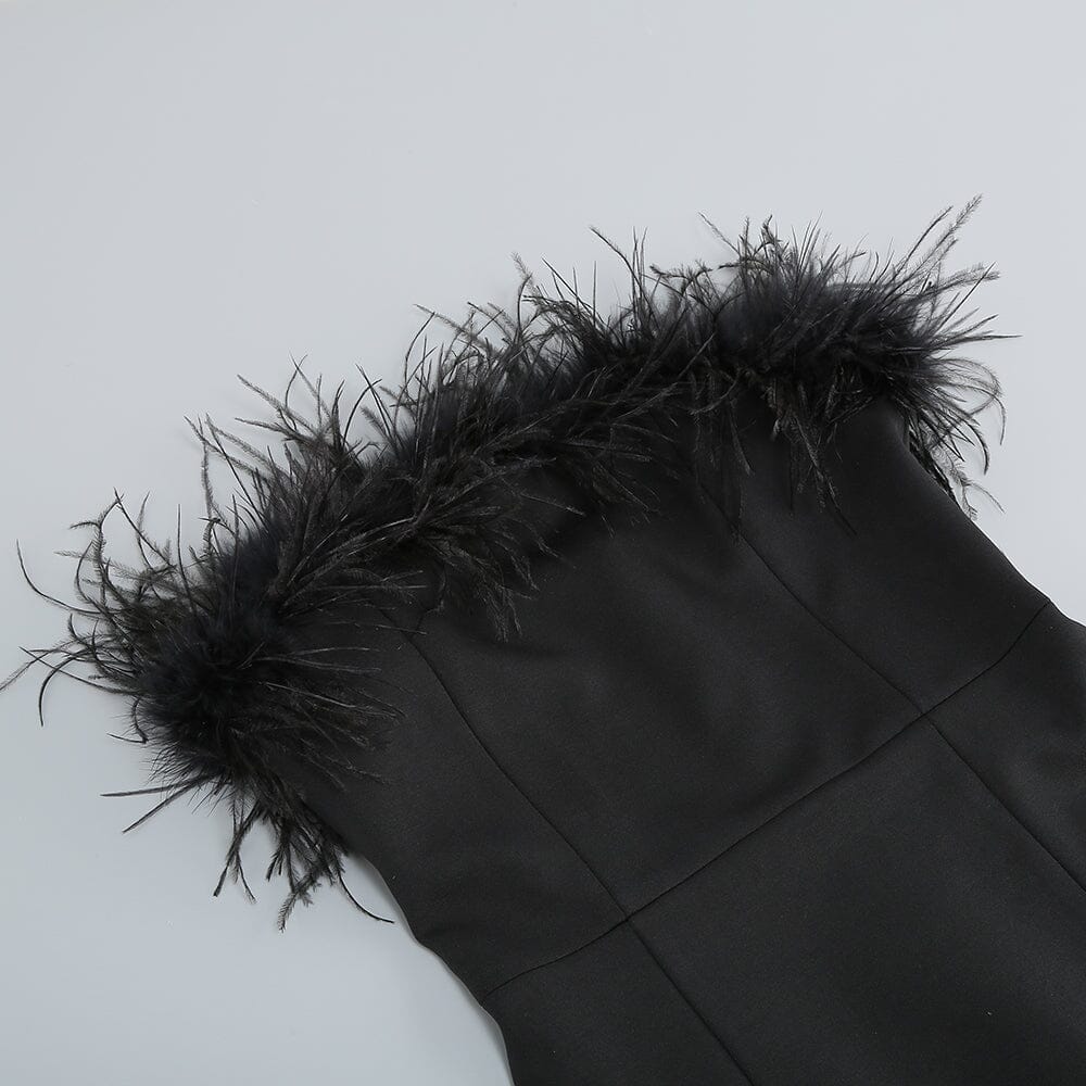 Inspired by the glamorous women of the Hollywood Golden era. the Age of Innocence dress is the perfect special occasion dress. This mini length dress features a strapless ostrich feather bustier with a fitted silhouette making it a one of a kind statement piece.