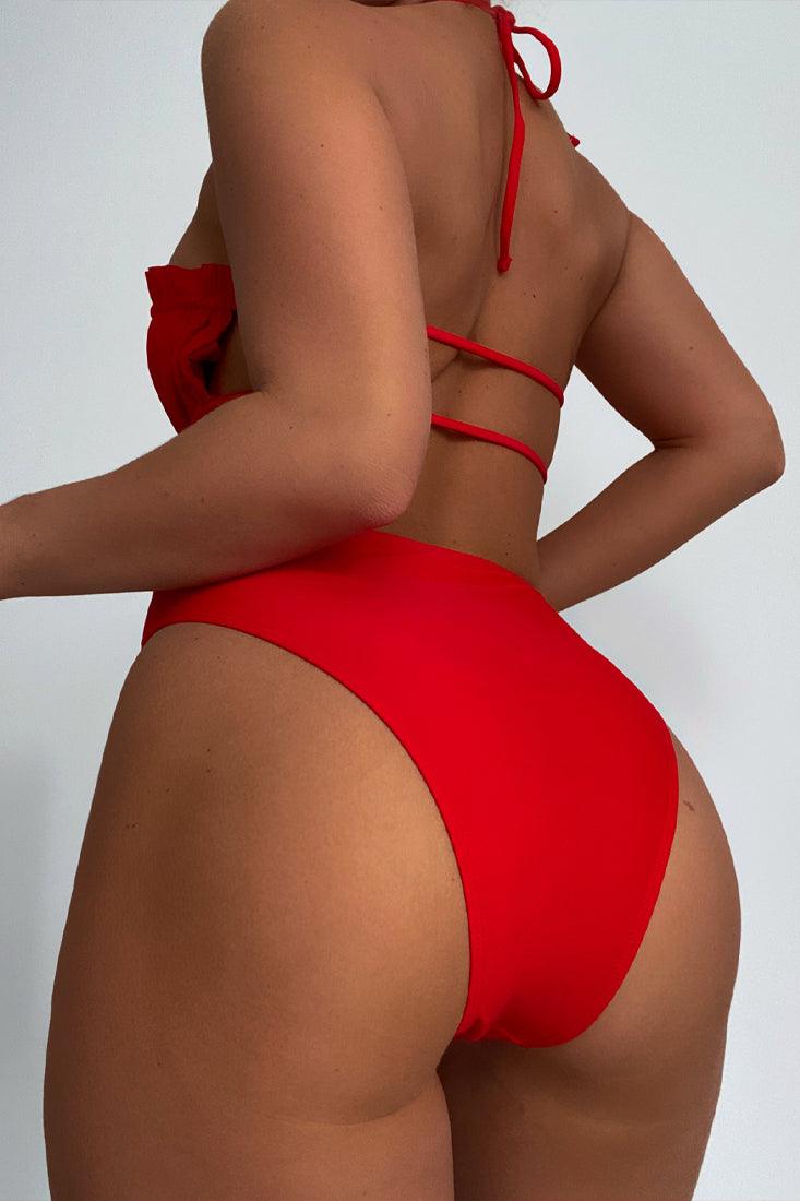Be fierce and in style with this sexy swimsuit! Featuring; one piece. sleeveless. tie straps. ruffled. halter. cheeky. 90% polyester. 10% spandex.
