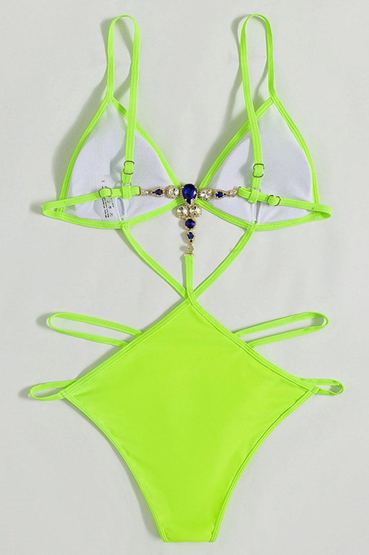 This sexy swimsuit would look amazing while lying out at the beach! Featuring; rhinestone. strappy. padded. cheeky. Followed by a sexy wear. 95% polyester 5% spandex