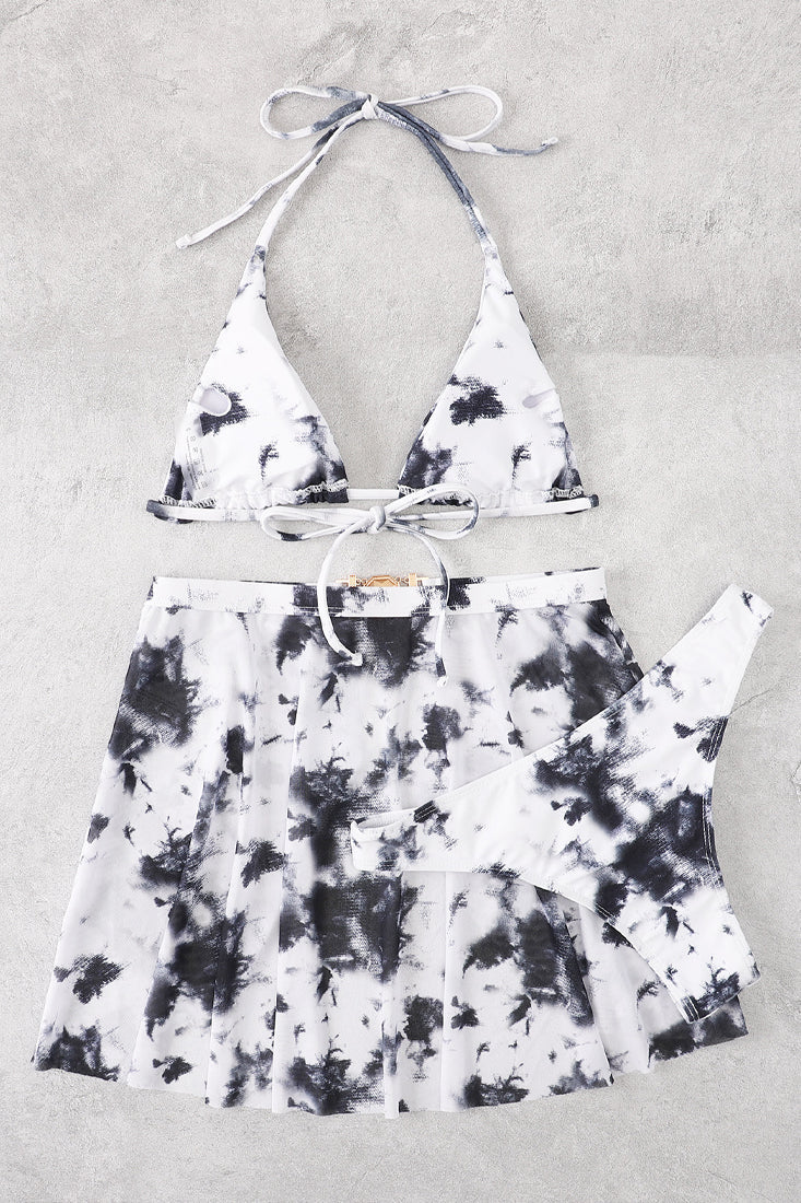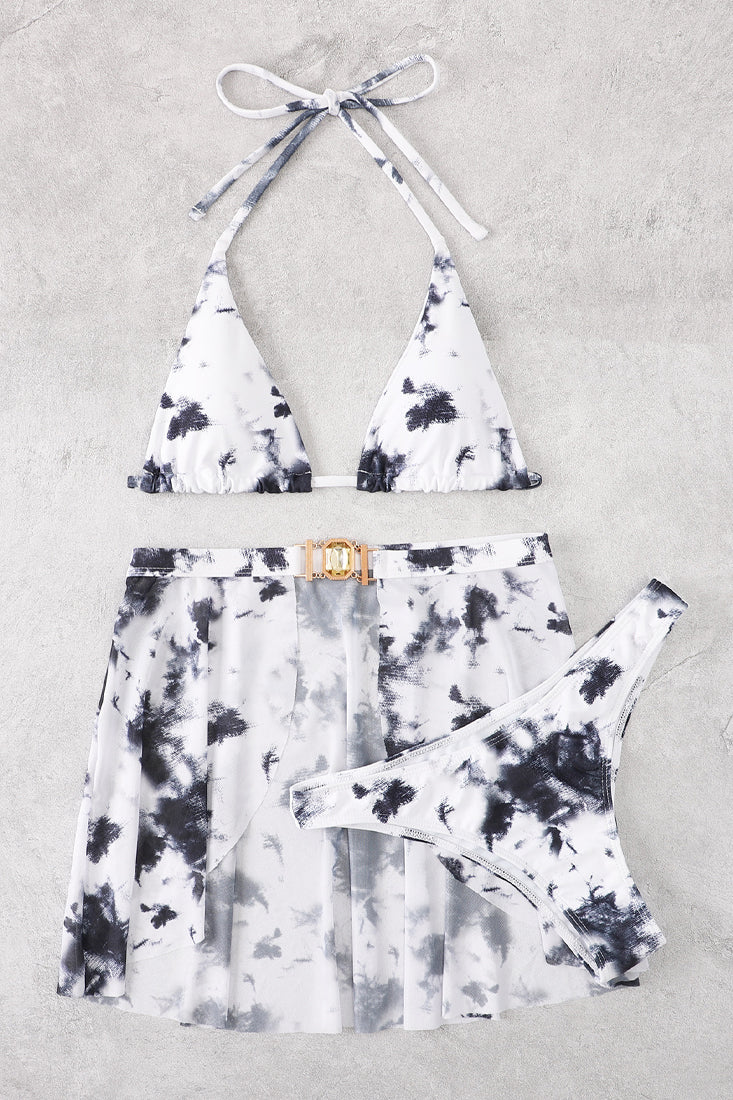 Be beach ready in this sexy bikini set! Featuring; sleeveless. halter. triangle top. strappy. matching bottoms. open cover up skirt with rhinestone accent. followed by a fitted wear. Stretch Fit.
