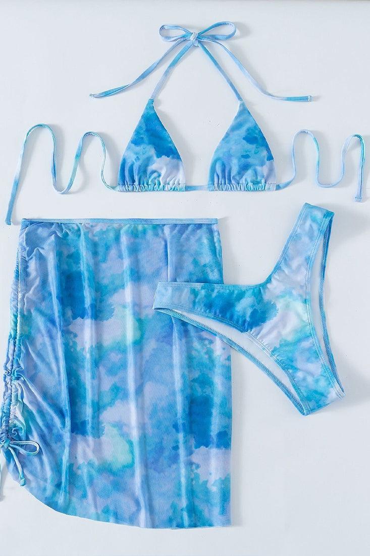 This 3 piece swimsuit is so cute for any pool party! Featuring; 3 piece. printed. two tone. mesh. coverup skirt. halter. matching bottoms. Followed by a sexy wear. 90% polyester 10% spandex
