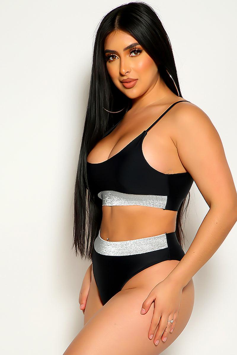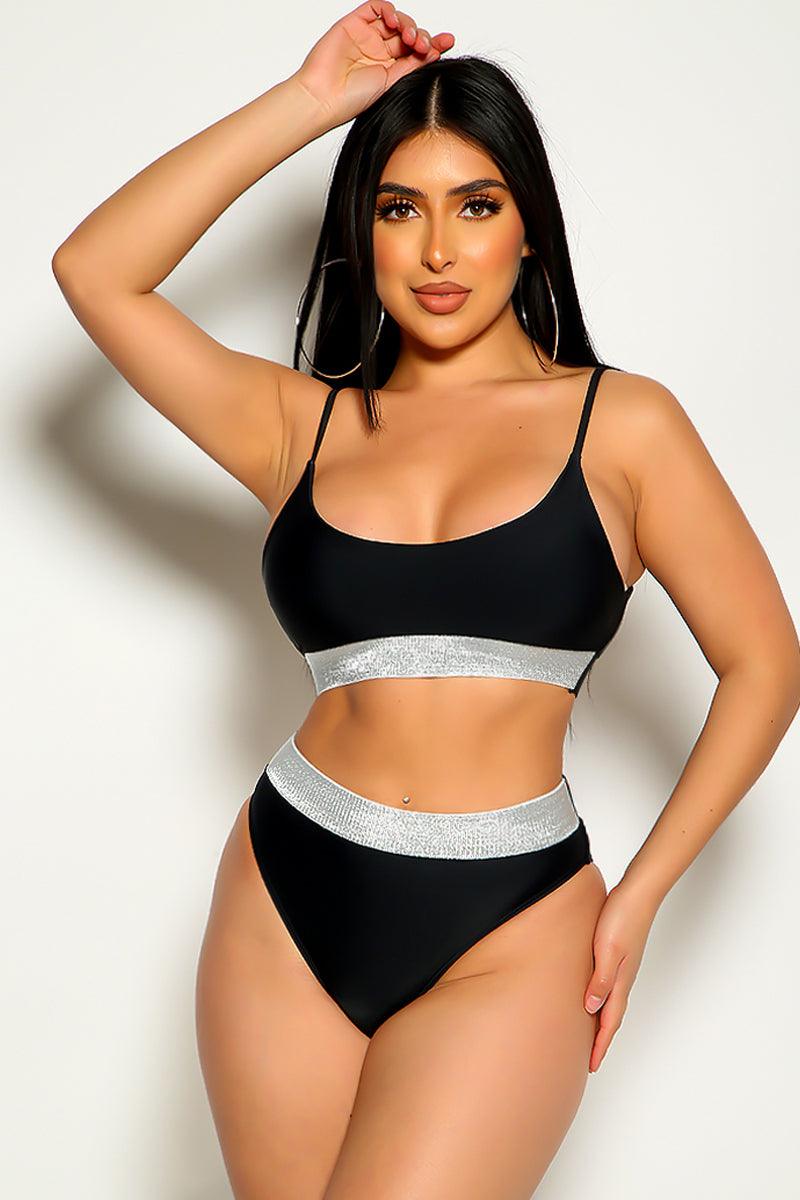 This sexy and chic swimsuit is perfect for a day spent lounging out by the pool! Featuring; two-tone. shimmery detail. scooped neckline. mid rise. cheeky. 95% Polyester 5% Spandex