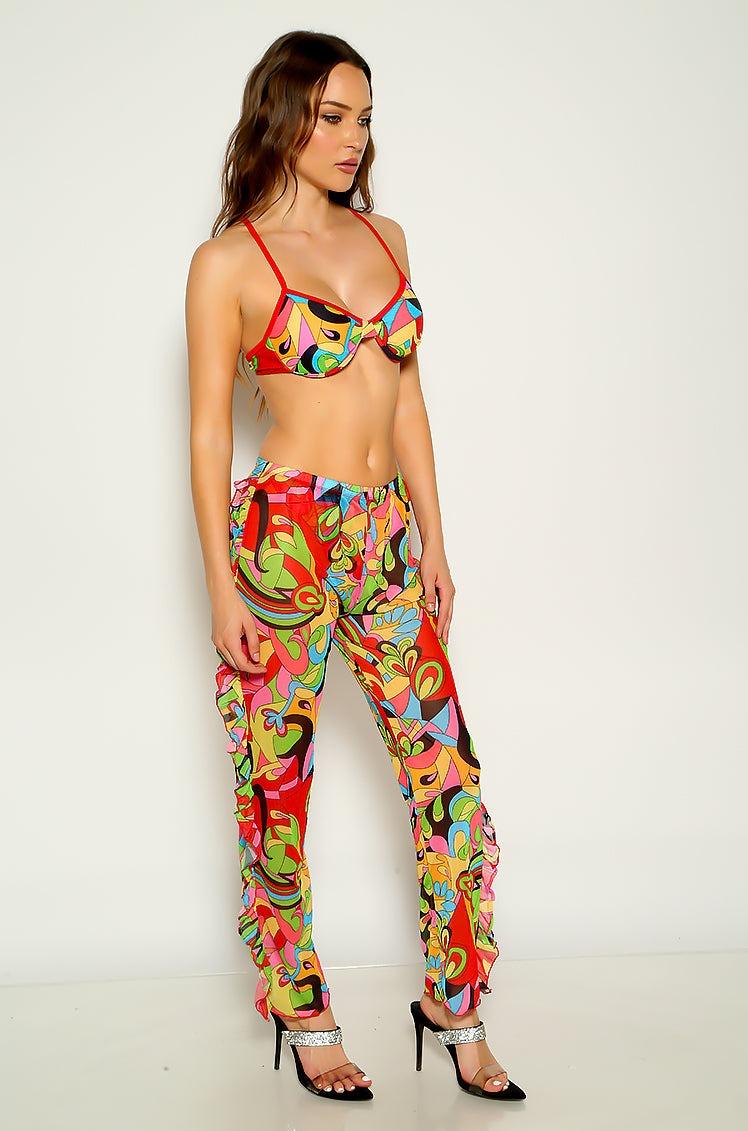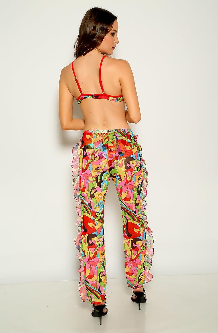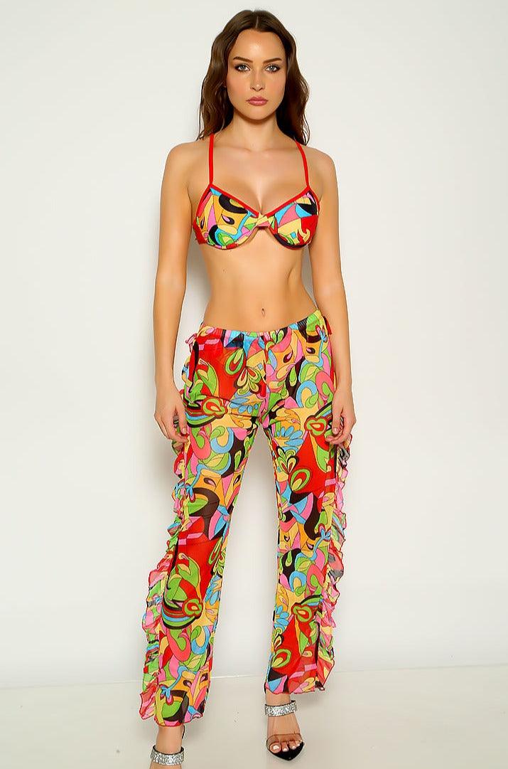 This 3 piece swimsuit is so cute for any pool party! Featuring; mesh. coverup pants. ruffled. flared. printed. two tone. matching bottoms. Followed by a sexy wear. 90% polyester 10% spandex