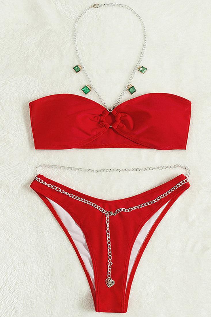 Be the talk of the pool party with this swimsuit! Featuring; halter. rhinestone detail. chain accent. matching cheeky bottoms. followed by a sexy wear. 95% polyester 5% spandex