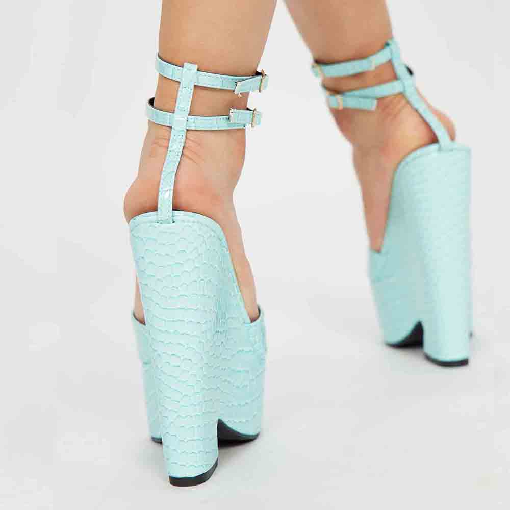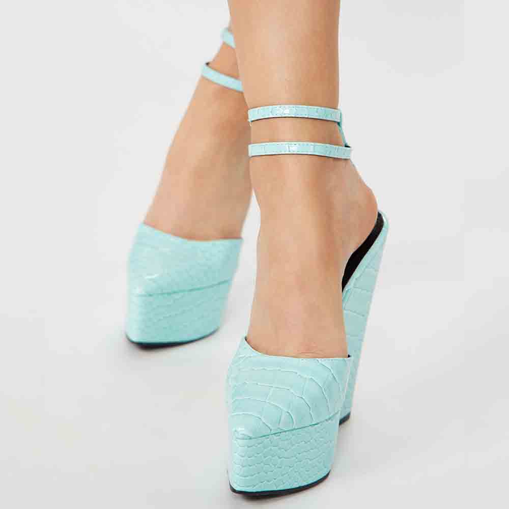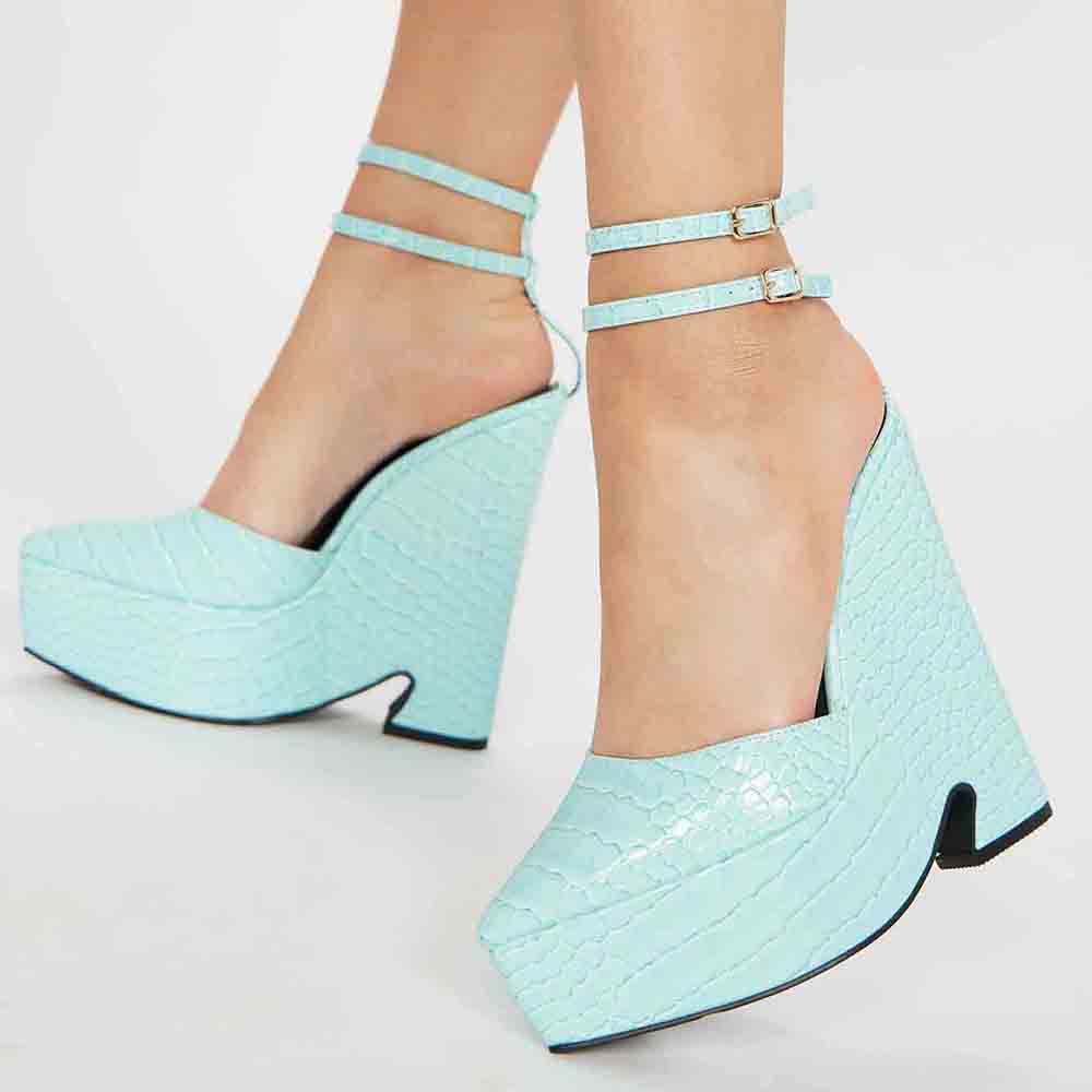 | Name | Turquoise Croco Embossed Pointed Toe Wedge Ankle Strap Platform Pumps |