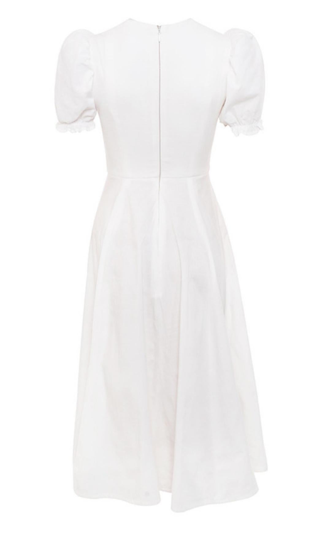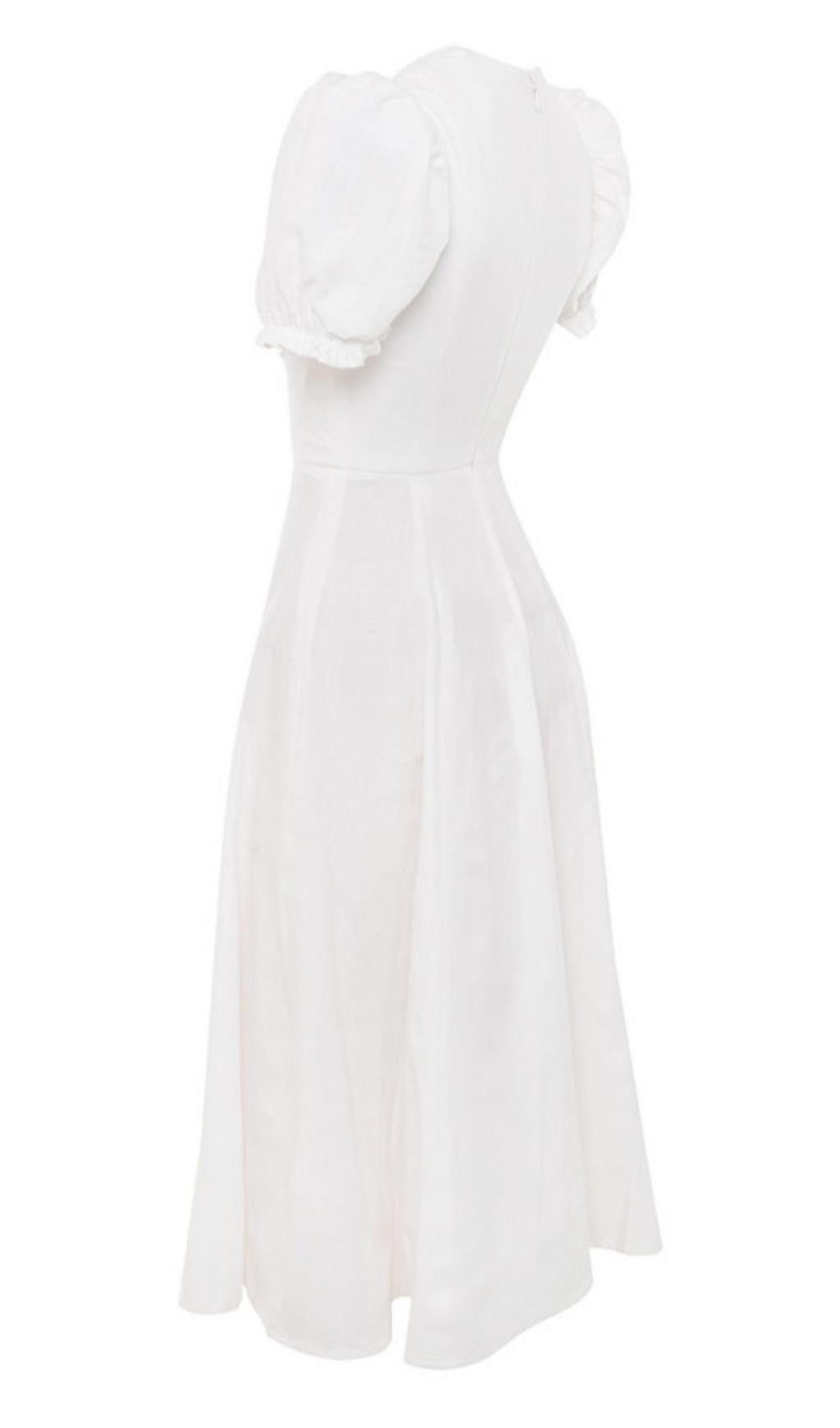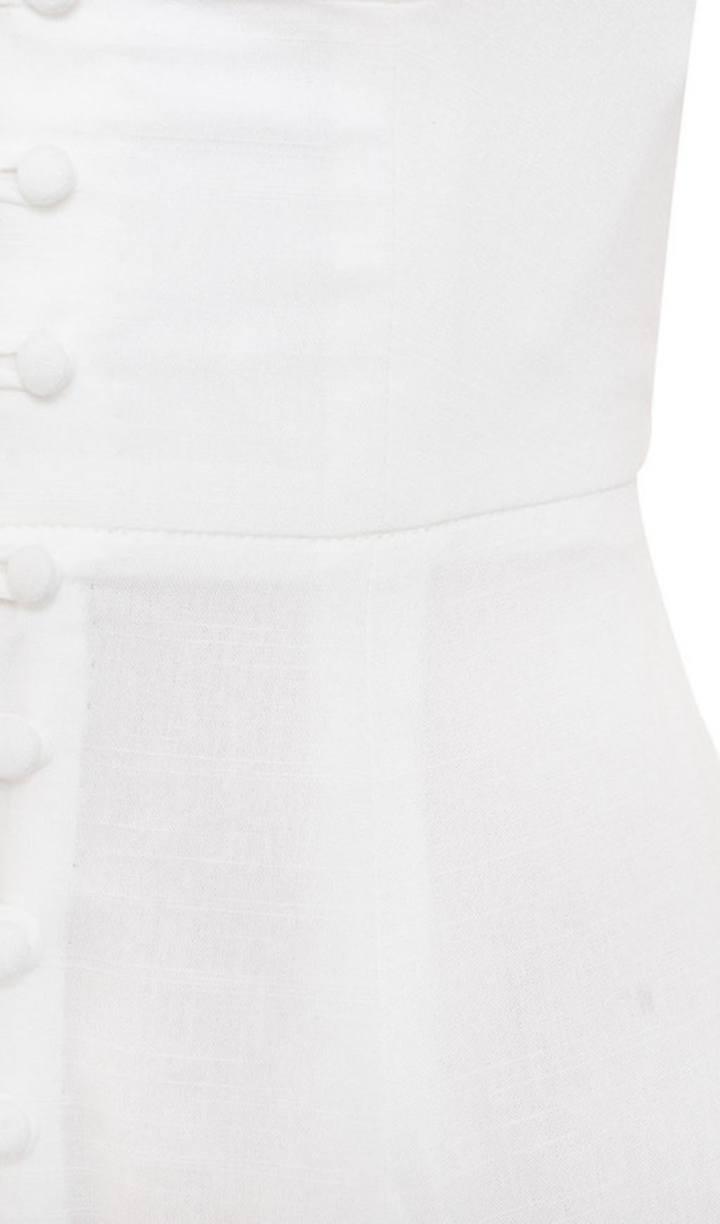 Feminine and floaty and perfect for Vacays. 'Ellery' is constructed from our lightweight linen in a fresh and crisp white. The neckline is a very pretty sweetheart shape that is good for all bust sizes as it's so wearable and it's gathered prettily with buttons to the front. The dainty puff sleeves have a special internal construction to ensure they stay upright and full and the bodice has lightly lined cups and cinches in at the waist for the prettiest silhouette. The skirt flares out and it has self covered buttons to the front that you can undo as high as you dare.