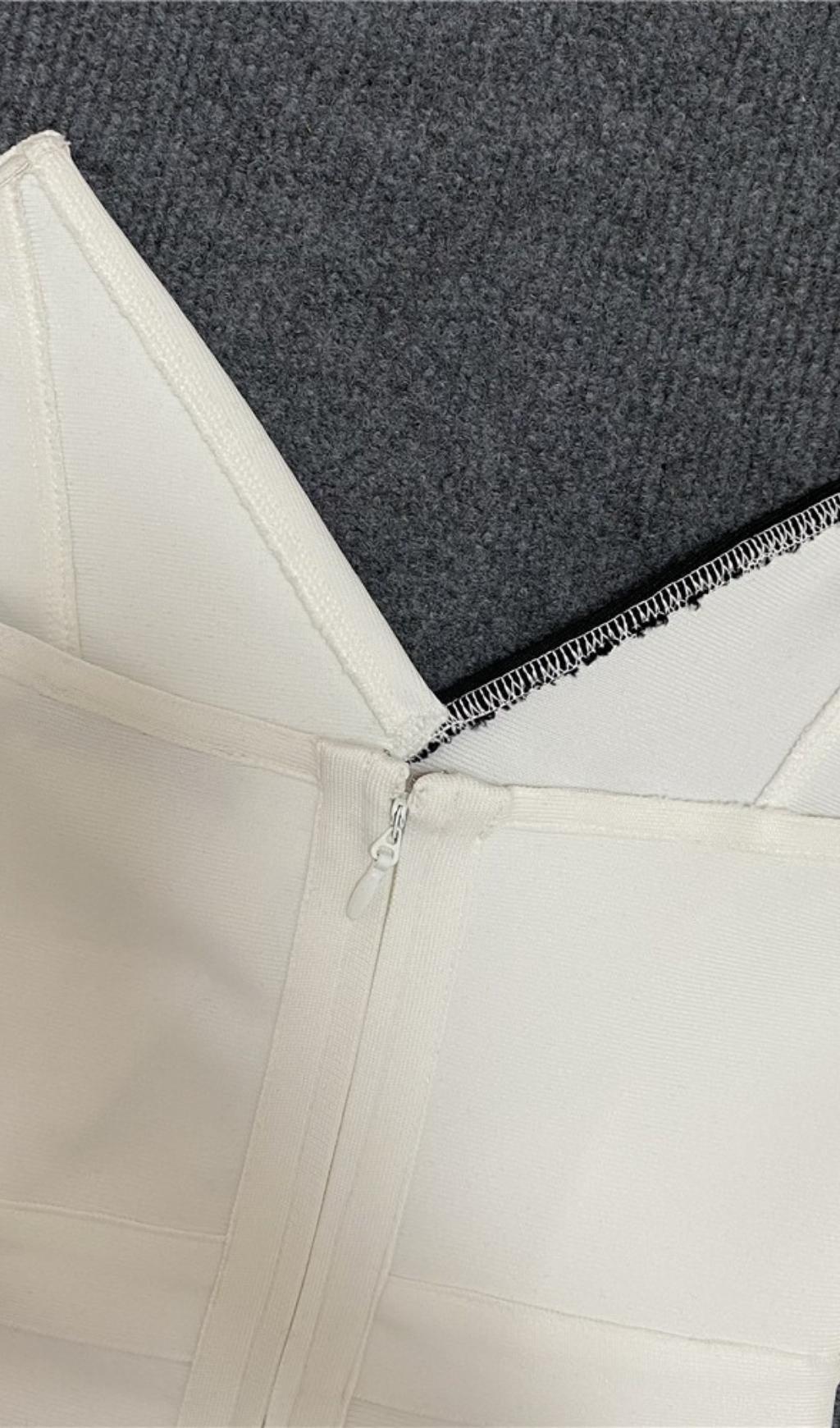 Update your new season wardrobe with our White Midi Bandage Dress. The midi dress is constructed from our ever-famous stretch bandage fabric to caress your curves and create a perfect silhouette.Special neckline design. small black embellishment make this dress elegant and fashionable.Pair with your favorite heels and you'll be ready for date night.