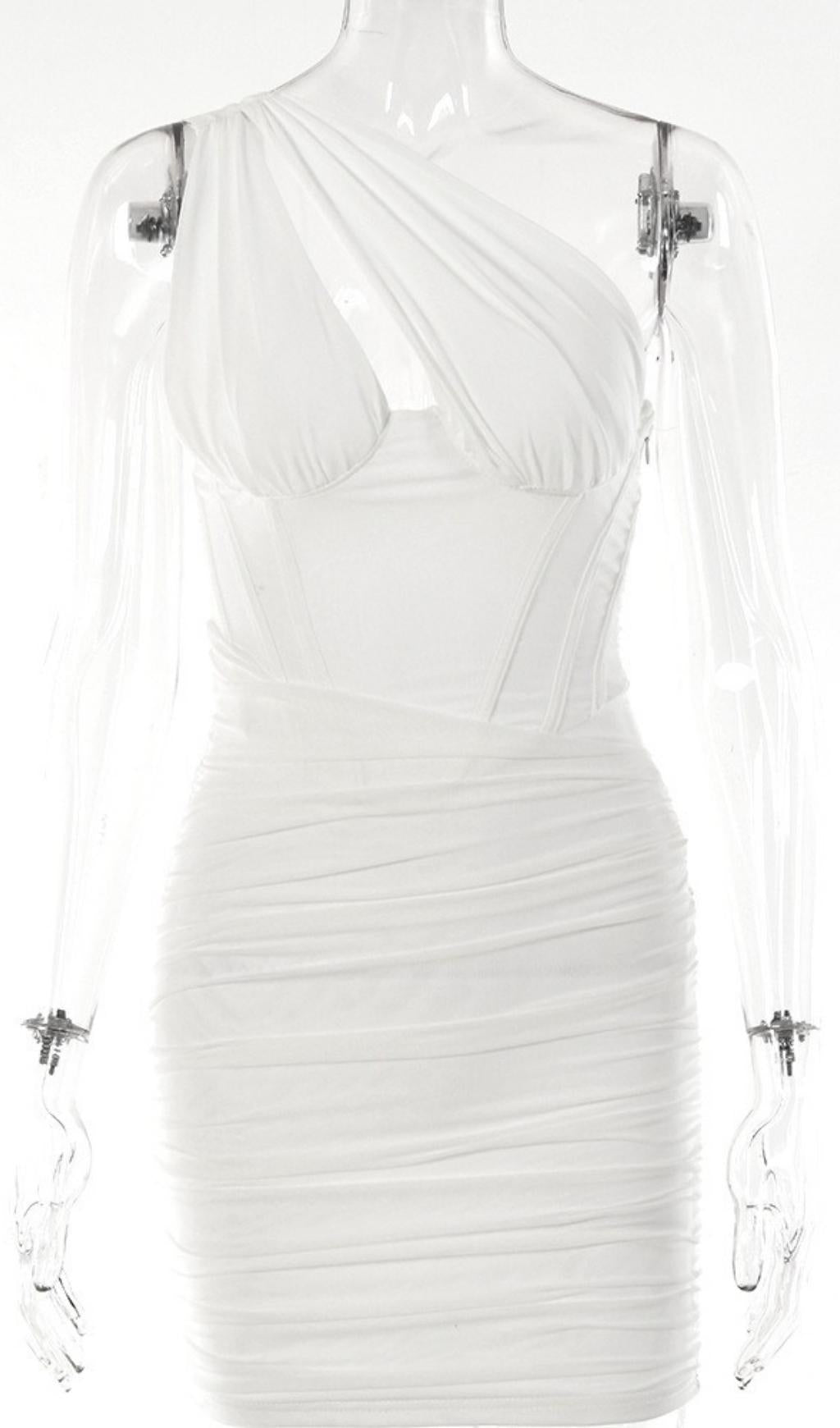 Our seductive White One Shoulder Cutout Mini Dresscrafted from a crisp cotton poplin in a soft white tone.The bodice features our amazing corsetry boning for a super cinching effect and the bust has built in underwired cups to escape the need for a bra as it has all the support you need.Pair with your favorite heels and you'll be ready for date night.