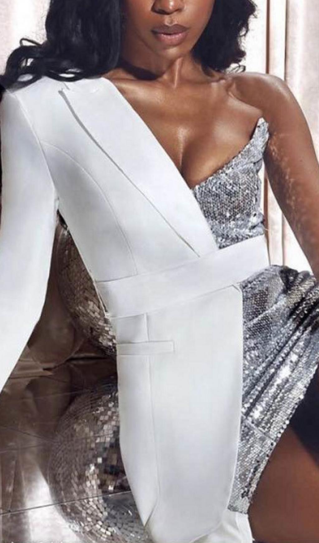 Made to draw attention. this half stretch sequin half satin crepe dress is sure to fit like a glove. With one sleeve and an open back its super breather able and easy to move in. The SliverNight is fully lined and made with an invisible zipper and clasp. Wear with a black pump for a polished look or a strappy sandal for a sexy spin. Either way this is sure to be a statement piece and have all eye on you!