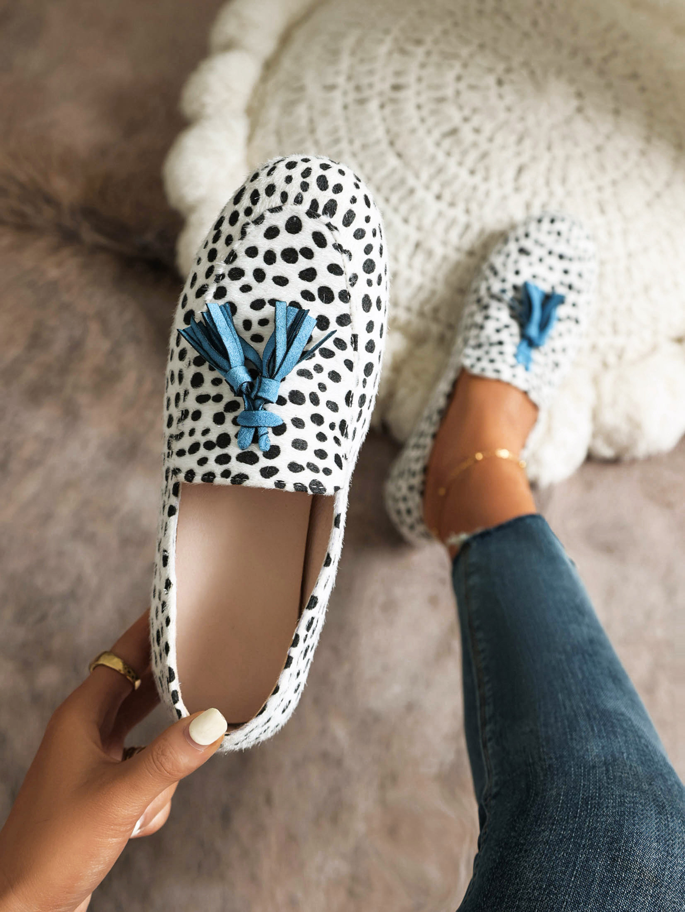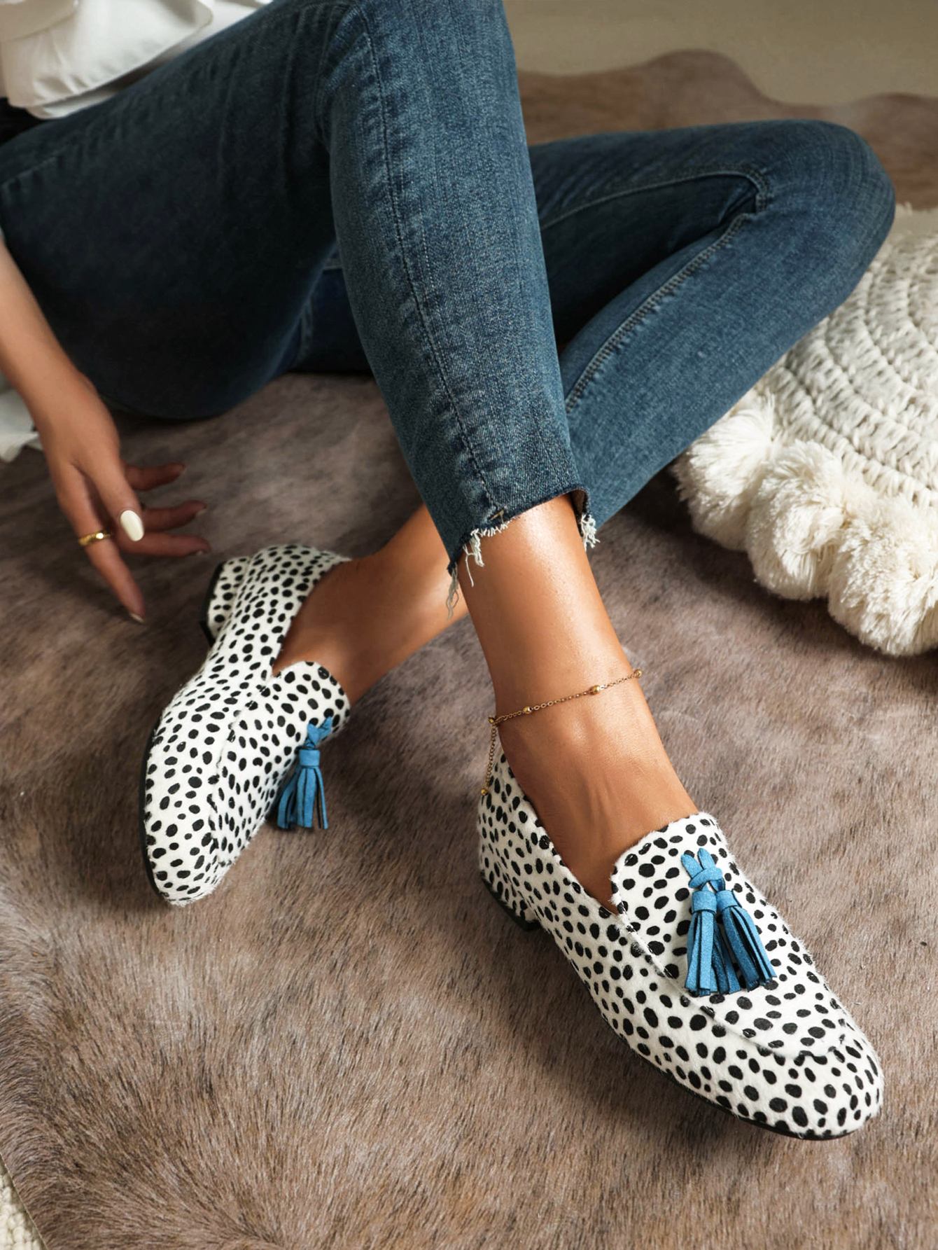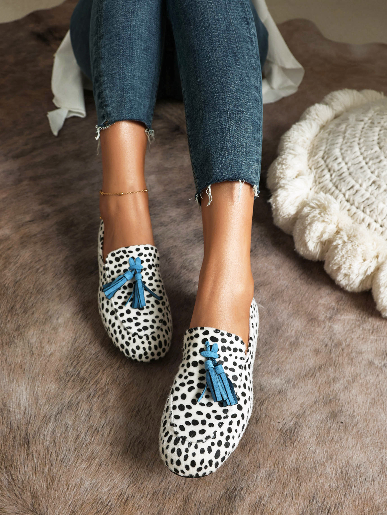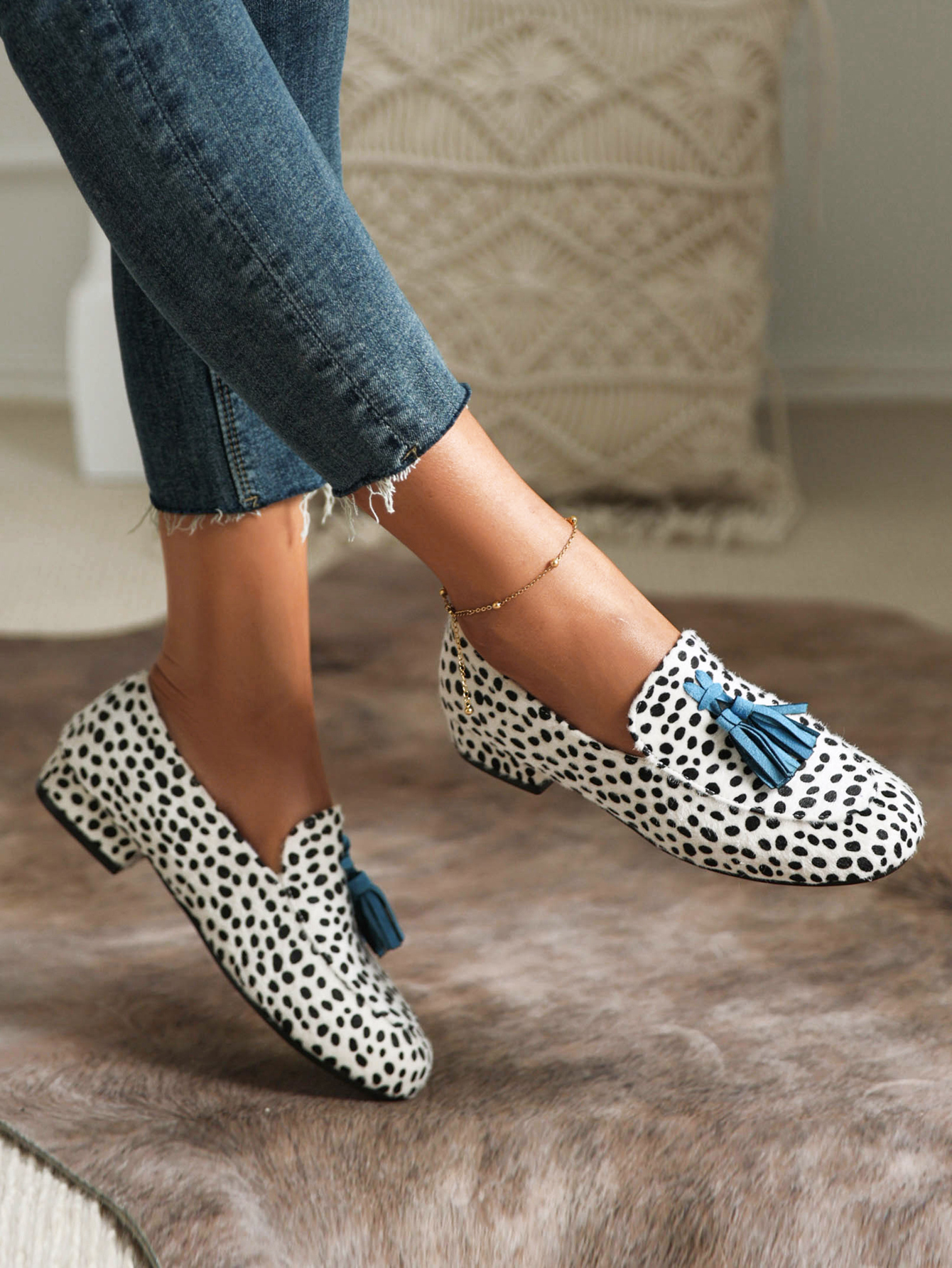 This loafer is a stylish addition to any casual outfit. The fringed trim and irregular dot print give it a unique and eye-catching look. It is perfect for a day out with friends or running errands around town. Not only does it look great. but it is also comfortable to wear all day long. So why not add the loafer to your shoe collection today?