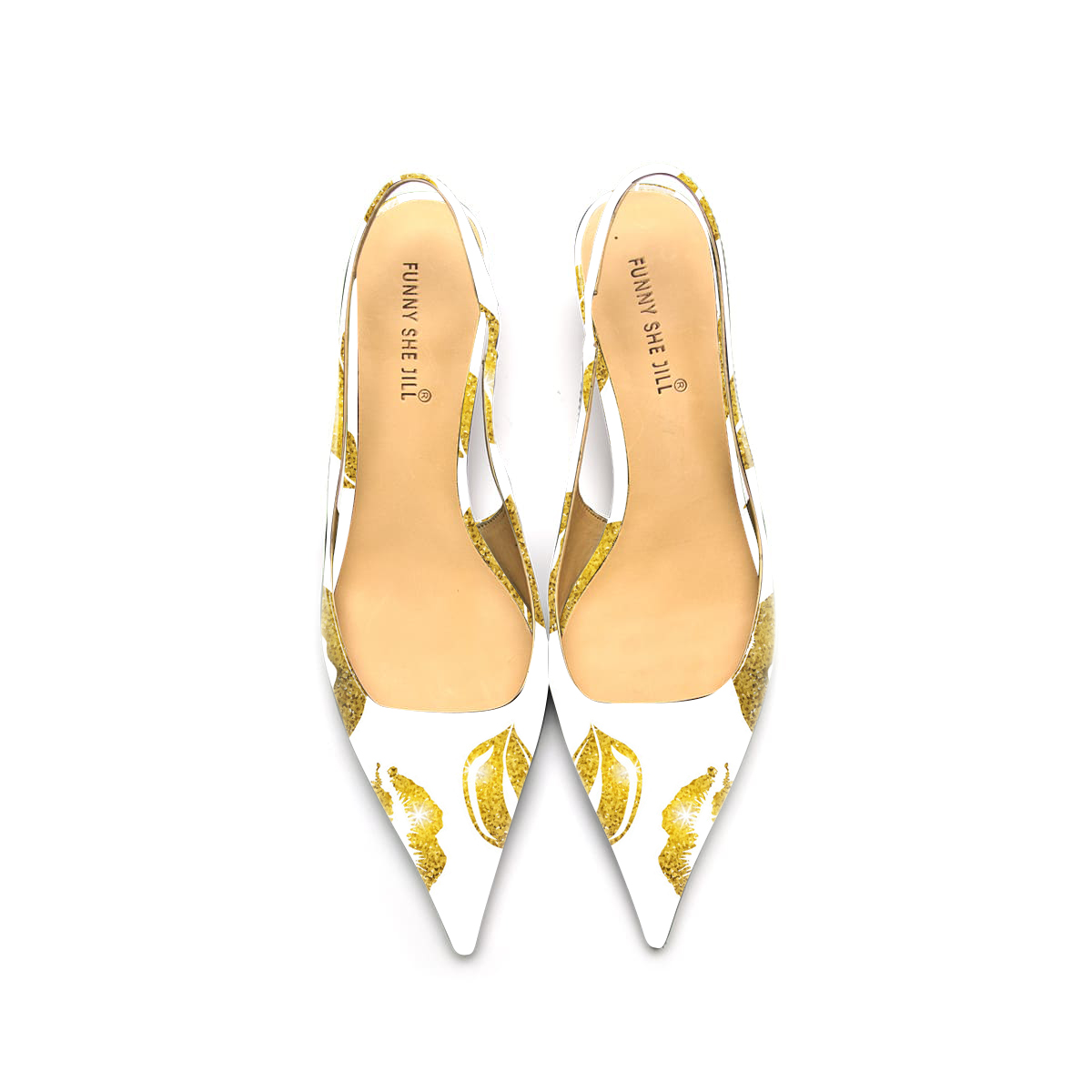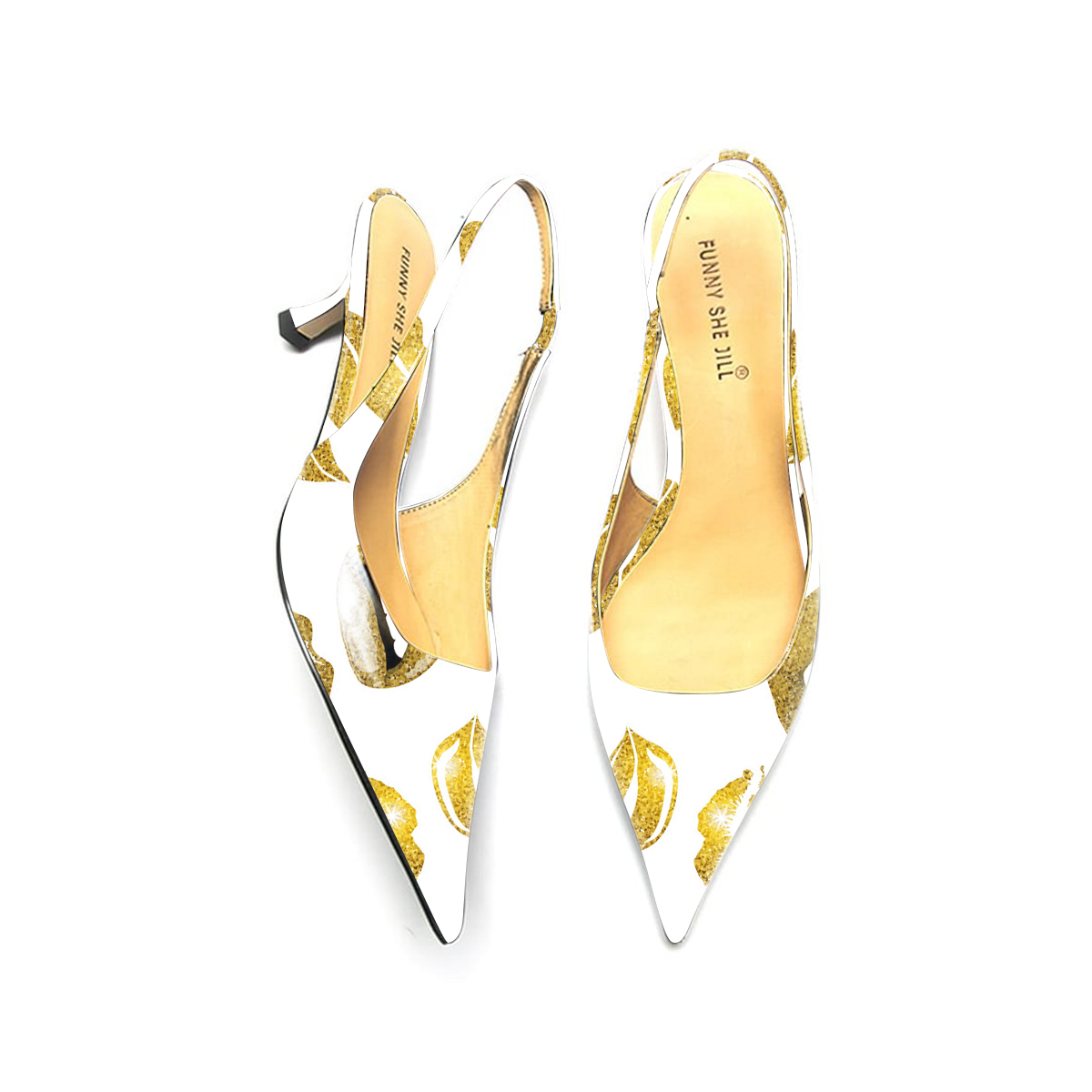 | Name | FSJ Gold Kisses Print Pointed Toe Kitten Heel Slingback Pumps |