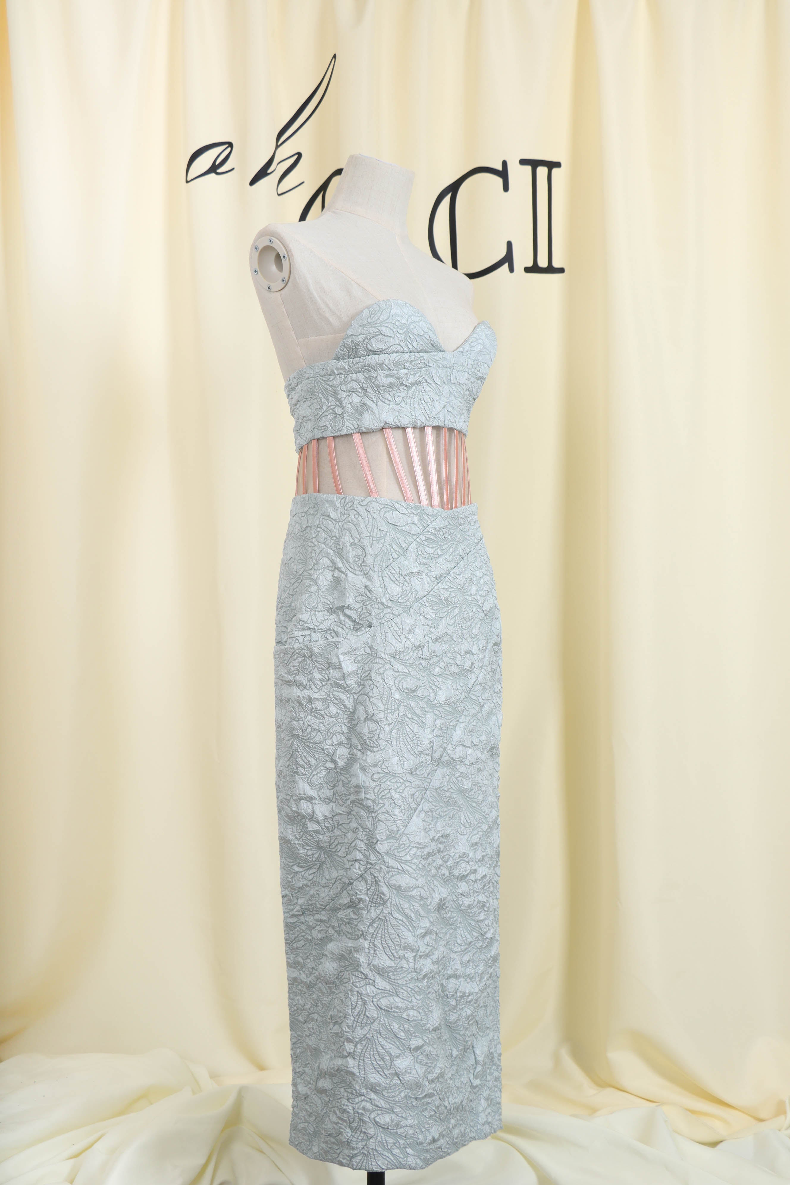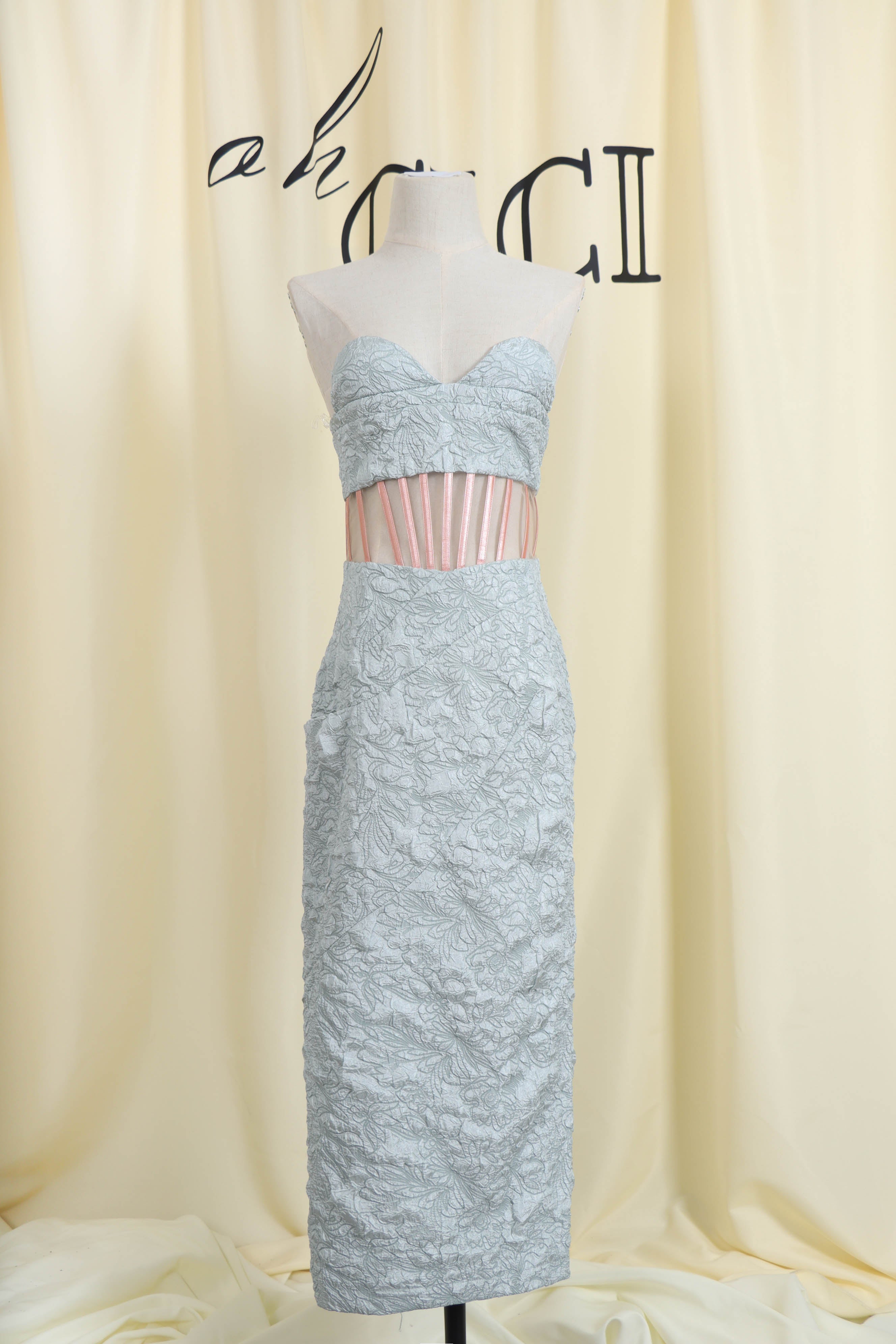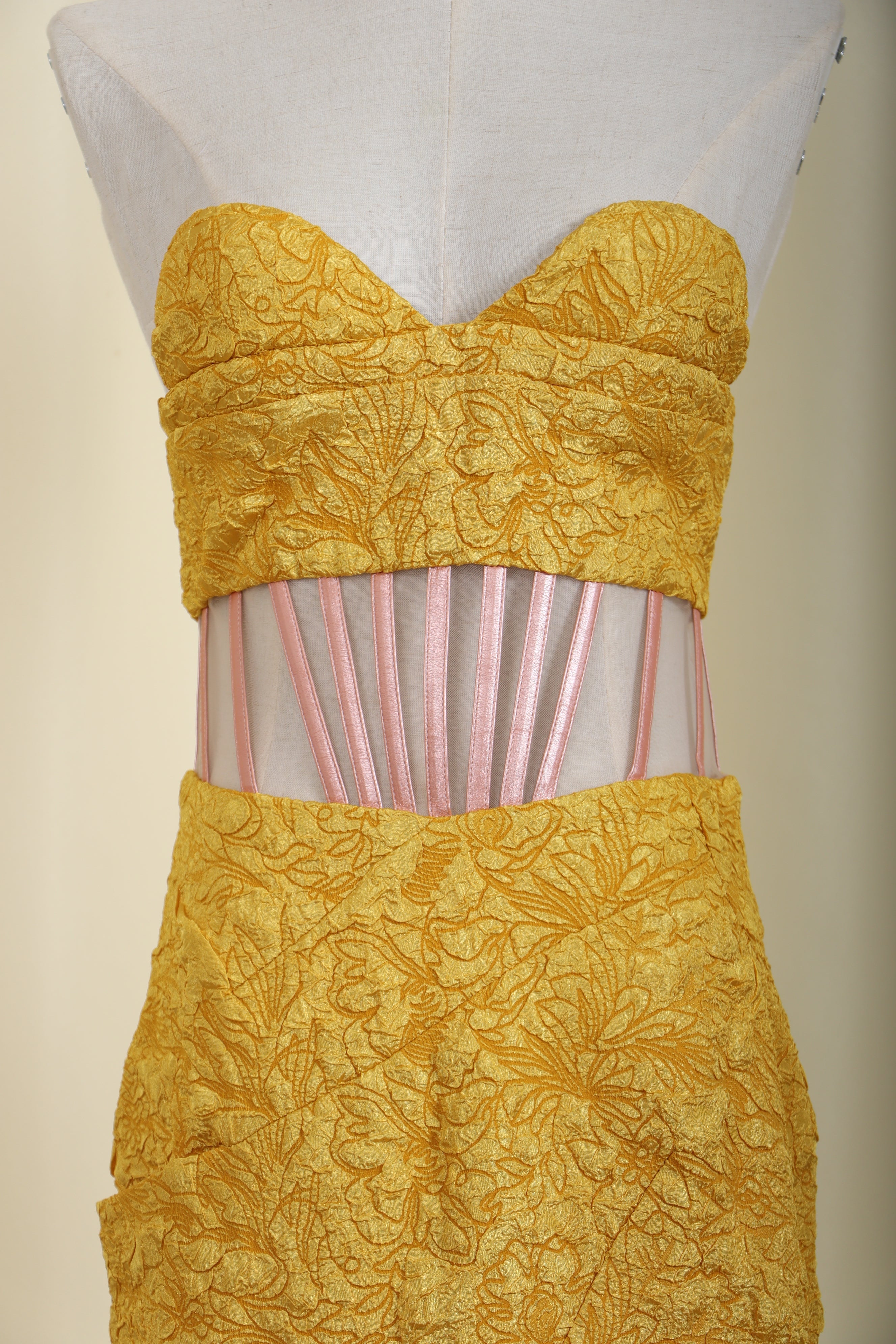 Fall for our Jacquard Strapless Midi Dress. This figure-perfecting party dress with cut-out details is one of our absolute favorites in the closet. Vibrant yellow tones not only make you look stunning. but also add a stylish style.Pair with your favorite heels and you'll be ready for date night.